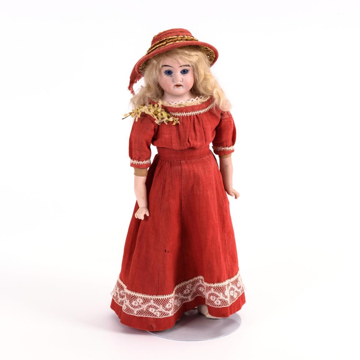 Brustkopf, feste blaue Augen, offener Mund, blonde Mohairperücke. Brauner Stoffkörper in alter Art mit Biskuitunterarmen. Rotes Kleid, Stohhut. Kopf durchleuchtet: ohne Defekte.