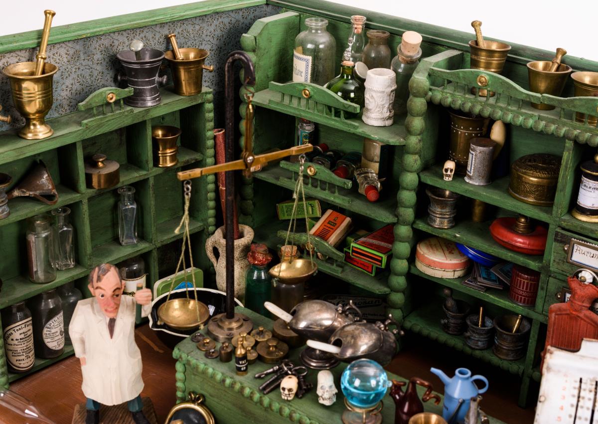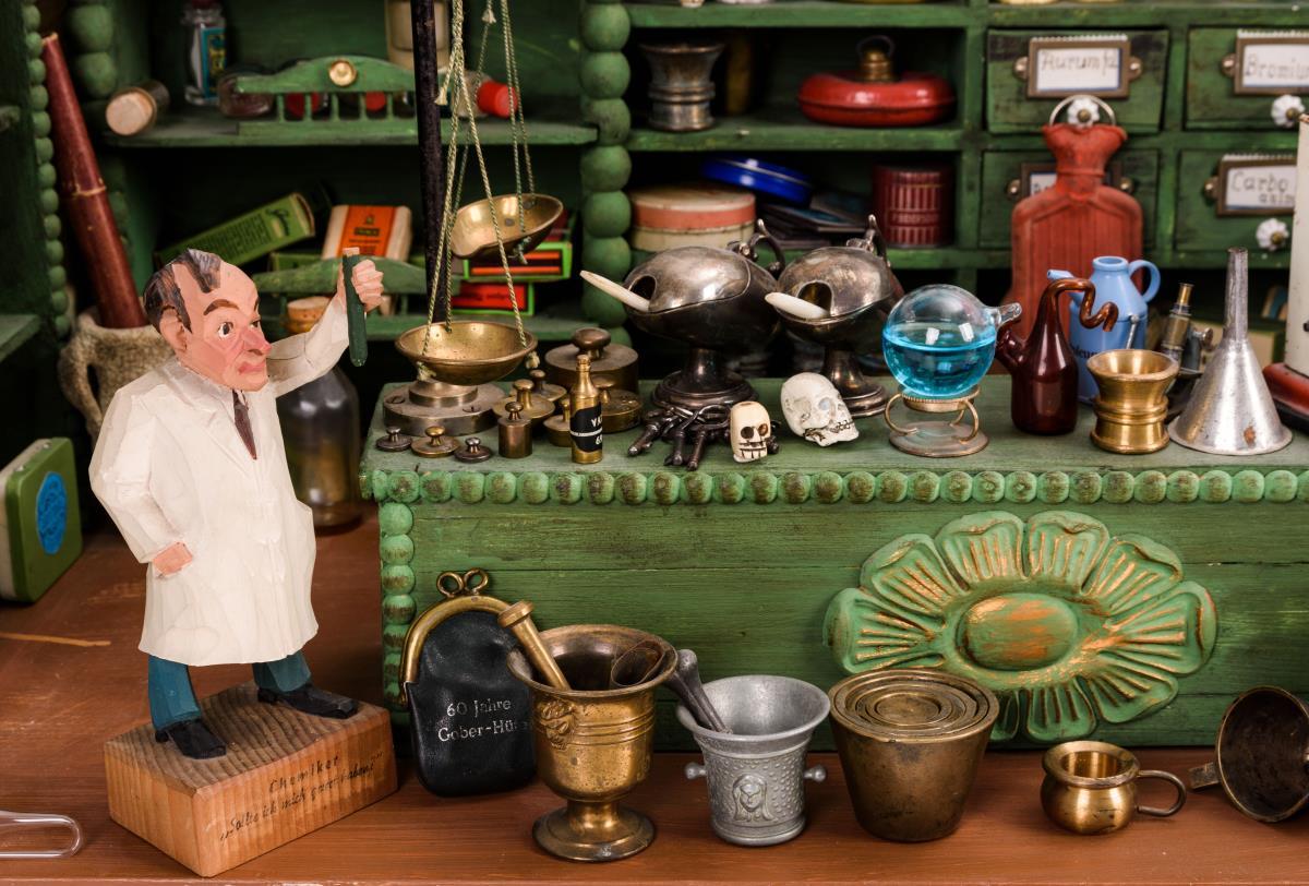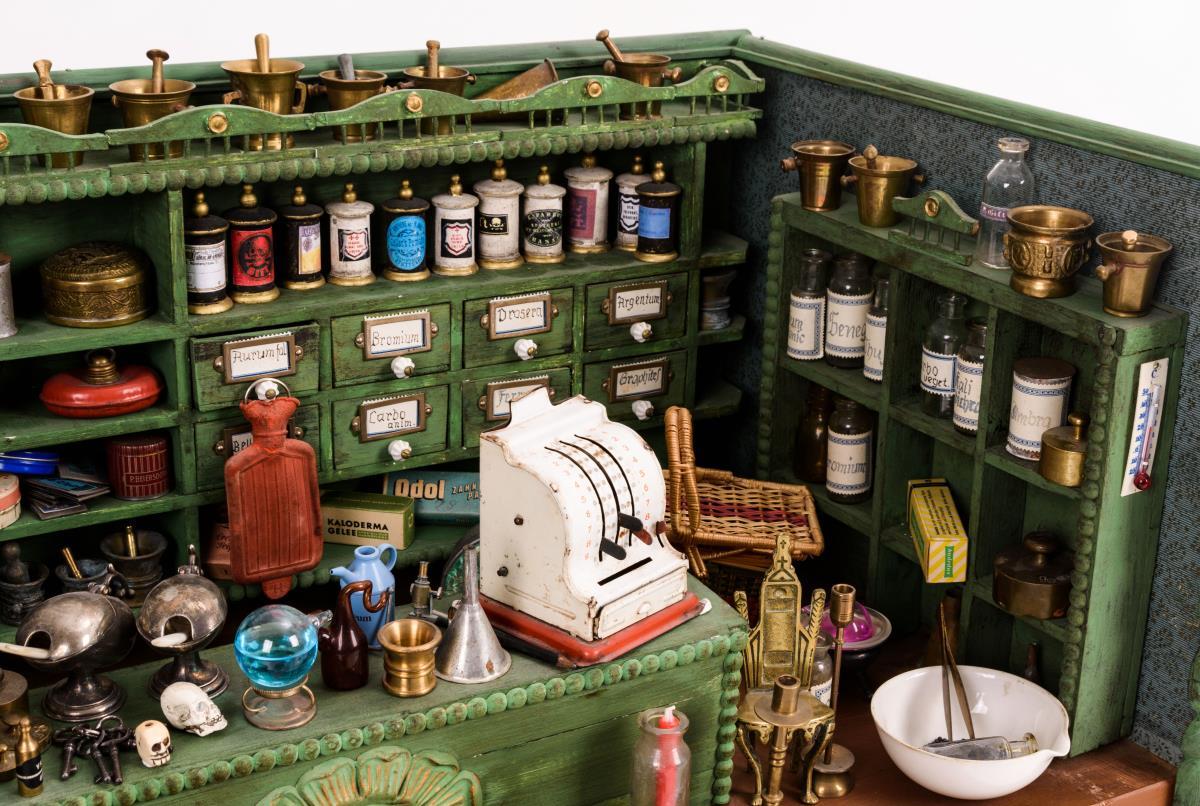 Leicht trapezförmiges 1-Raum-Gehäuse mit gedrechselten Frontlisenen und festem Ladeneinbau mit Regalen und Theke. Reich ausgestattet mit Dosen, Apothekengefäßen, Fläschchen, Messingmörsern, Balkenwaage und Blechkasse. Dazu geschnitzte Holzfigur "Chemiker" (H 14,5 cm). Altersspuren.
