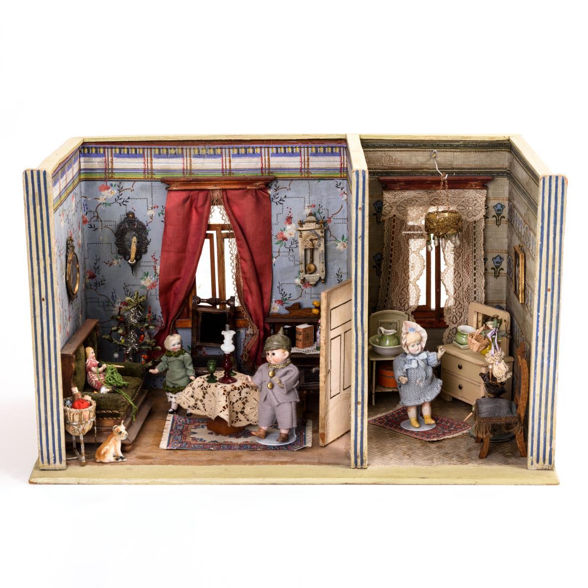 Schlichtes Gehäuse mit beweglicher Tür, 2 verglasten Fenstern und Gardinen. Stube mit Gründerzeit-Sofa, 2 Stühlen, Sekretär, Weihnachtsbaum und Nähkorb. Kleine Kammer mit Spiegelkommode, Waschtisch aus Blech, Schirmständer, Stuhl etc. Dazu 4 Püppchen, darunter defekter Soldat mit anmodelliertem Helm. Bespielt, mit Altersspuren und Defekten. Dazu 3 Plexiglasscheiben zur Abdeckung.