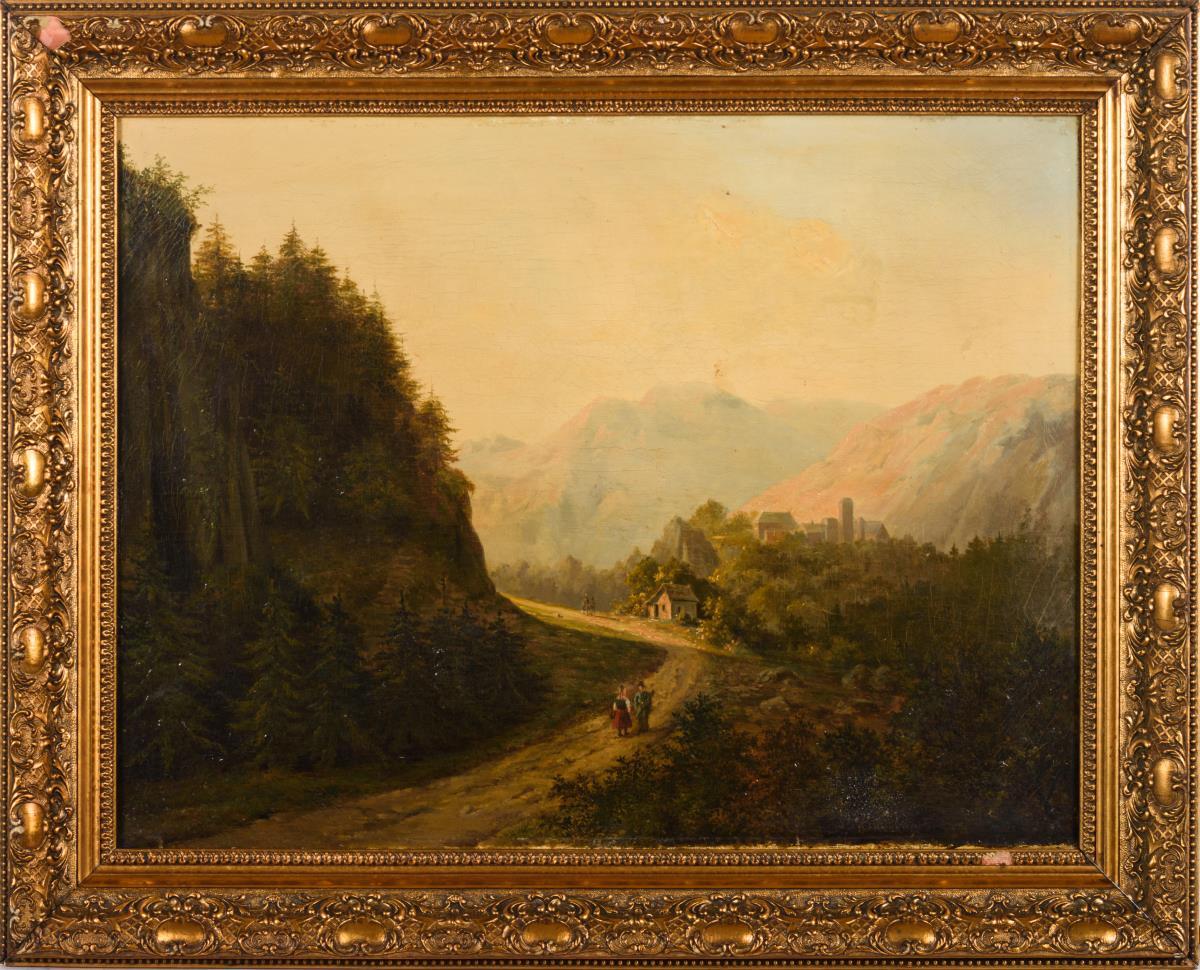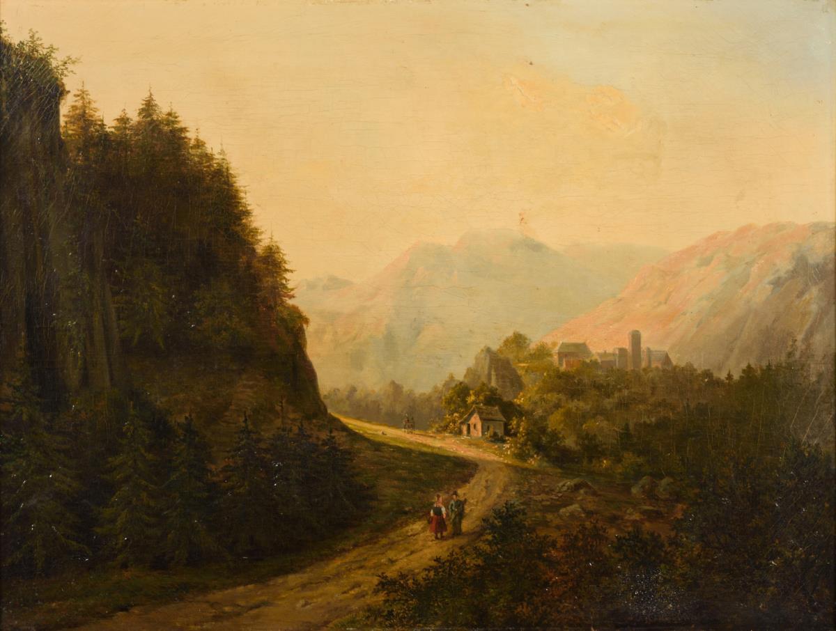Staffagefiguren auf einer Straße am Berg im abendlichen Sonnenschein nahe einer Stadt. Leinwand doubliert.