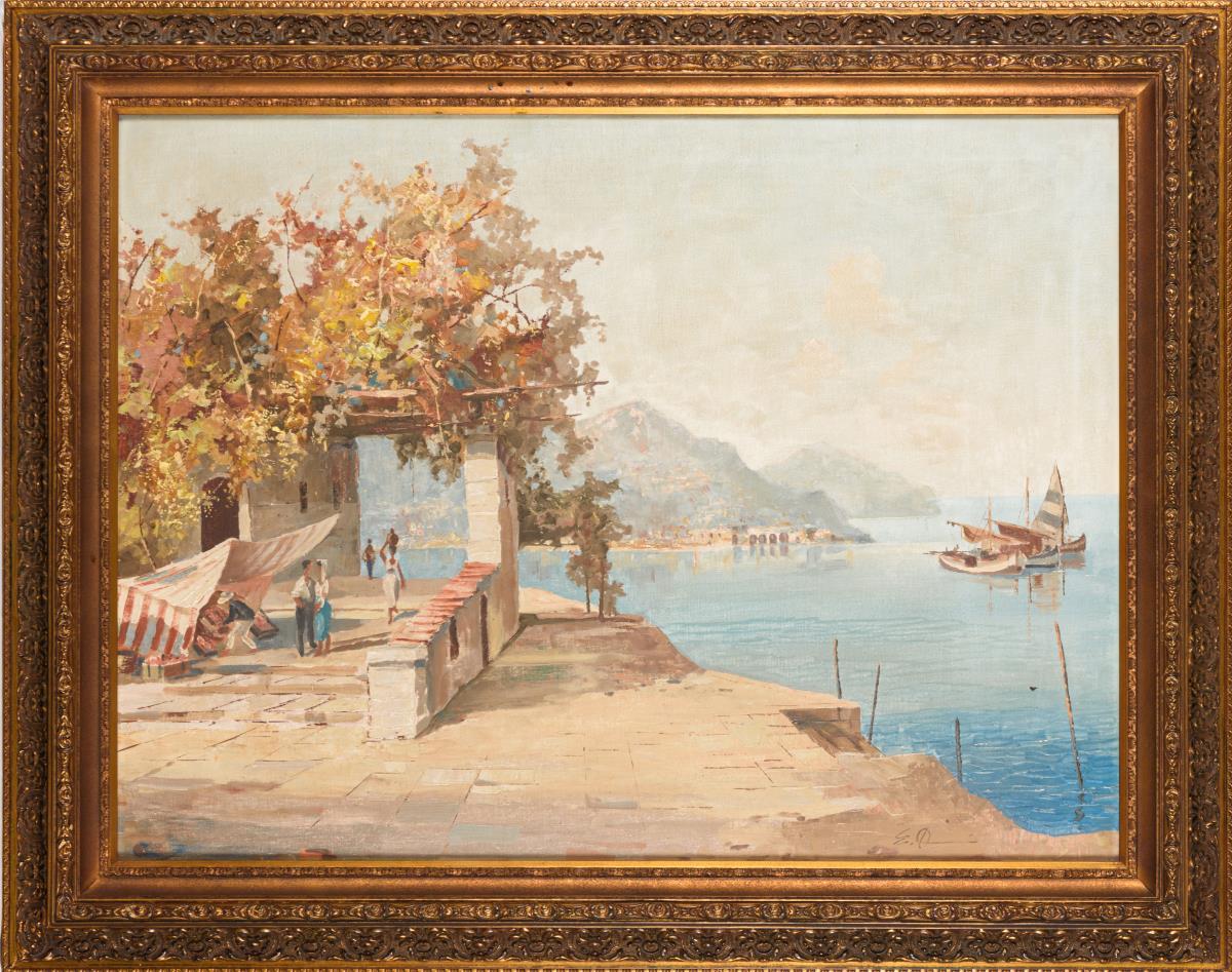 Helles Licht über dem Platz am Ufer mit Staffagefiguren im Sonnenschein.