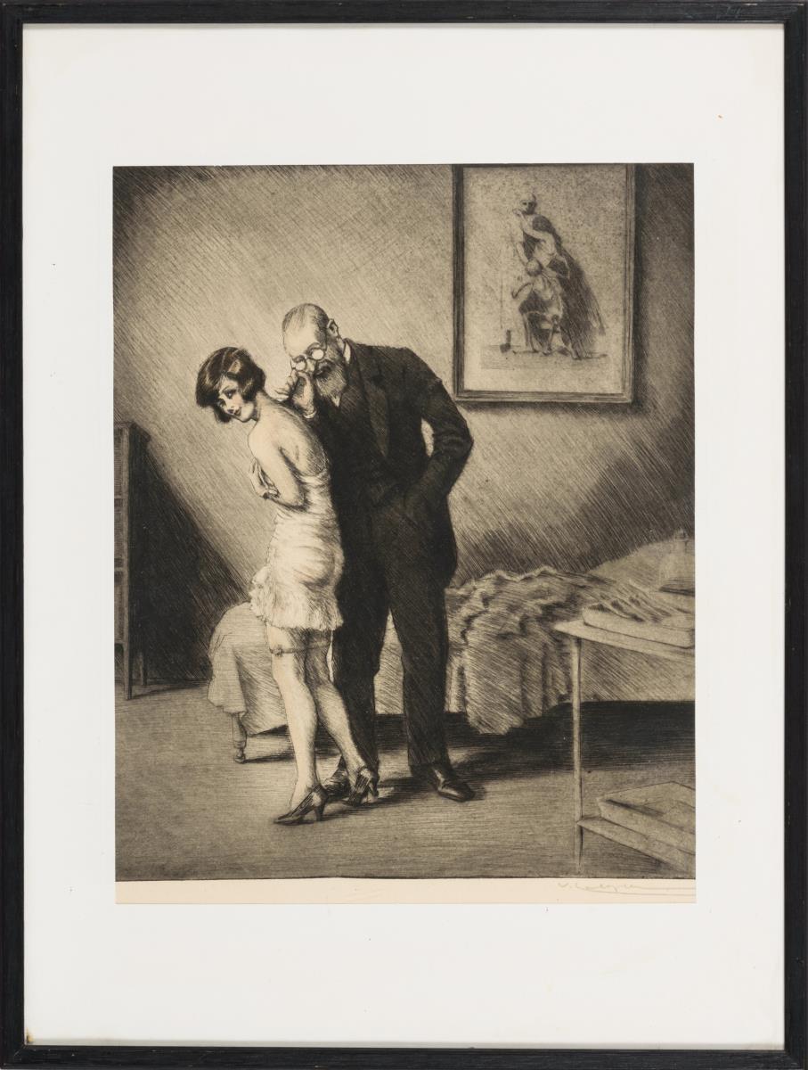 Erotische Szene mit lasziver Schönheit und älterem Herren in einem Untersuchungszimmer, im Stile Max Brünings. Verso Klebespuren, abgegriffene Ecke unten links.