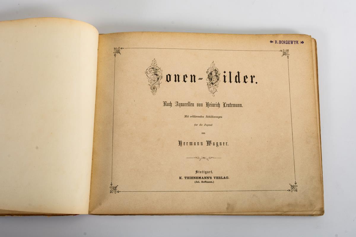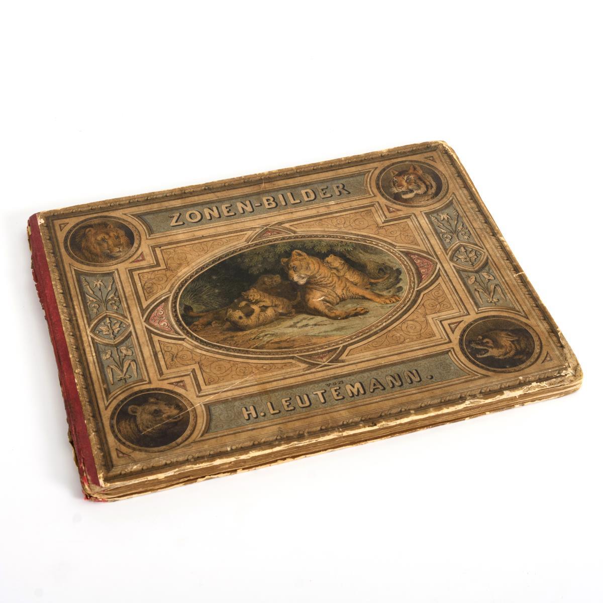 Ca. 20 Blätter mit Farblithographien und dazugehörigen Textseiten. Tierdarstellungen, oft mit Jagdszenen durch Tier und Mensch. Blätter schwach fleckig, eine Seite stärker eingerissen, sonst altersgemäße Gebrauchsspuren. Rücken defekt aber fest.