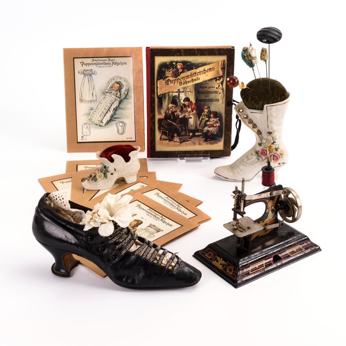 Casige-Nähmaschine (1930er Jahre), Reprint "Puppenmütterchens Nähschule von Agnes Lucas. Schnittmuster und Pausevorrichtung", alter Damenschuh, 2 Biskuitporzellanschuhe als Nadelkissen, 1x mit Hutnadeln. Altersspuren, Porzellan mit kleinen Bestoßungen.