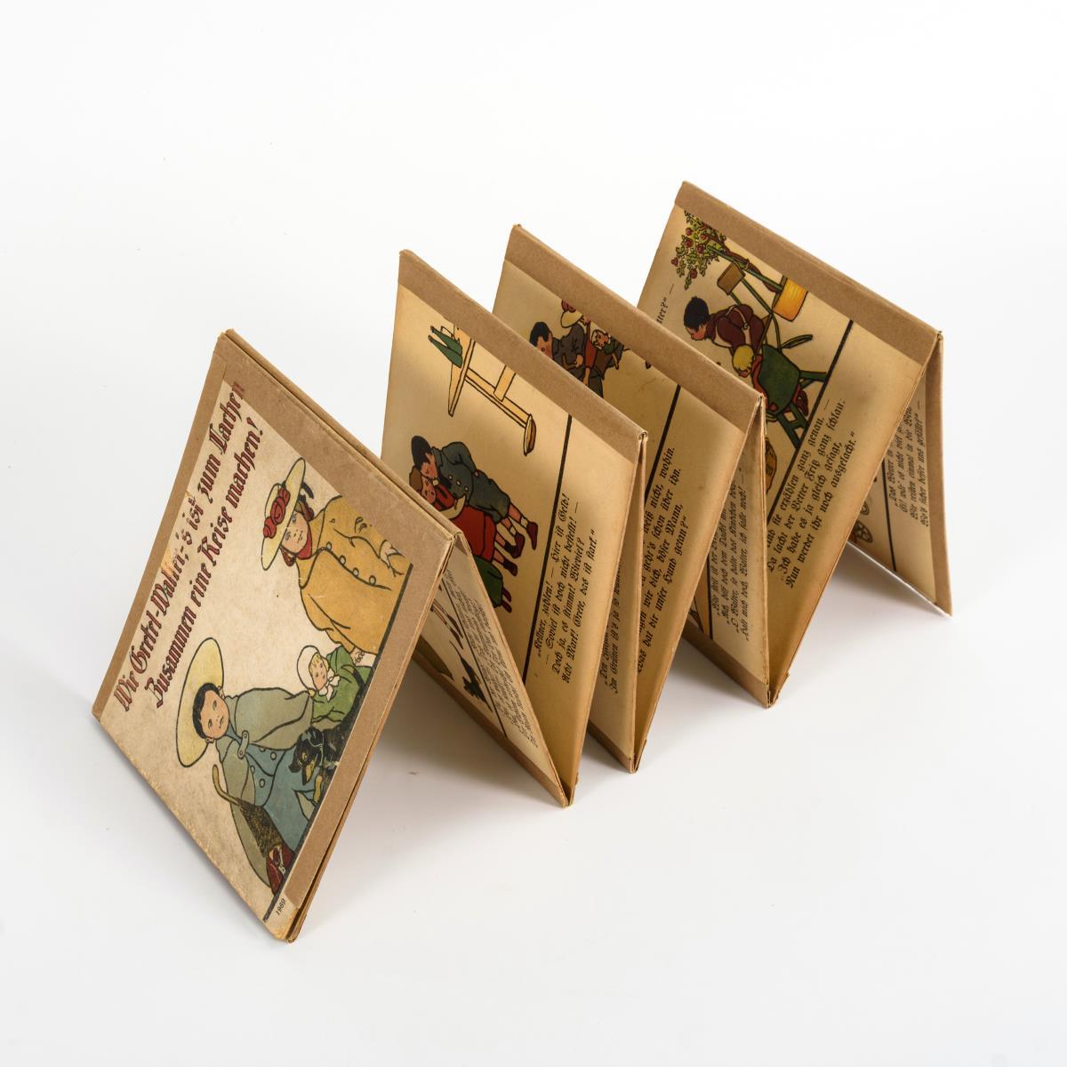 "Wie Gretel - Walter, -s ist zum Lachen, zusammen eine Reise machen!" Leporello mit 10 Blättern. (Verlag Löwenssohn, 1909). Gelenke mit Papierband nachgeklebt. / "Büchlein "Dies und Das".