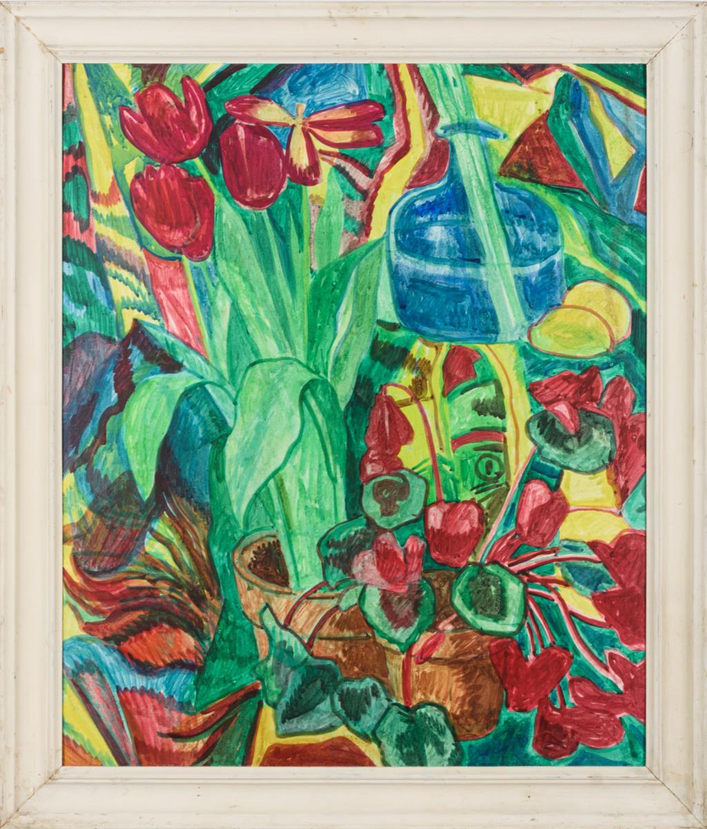 In leuchtenden Farben dargestellte Topfpflanzen.