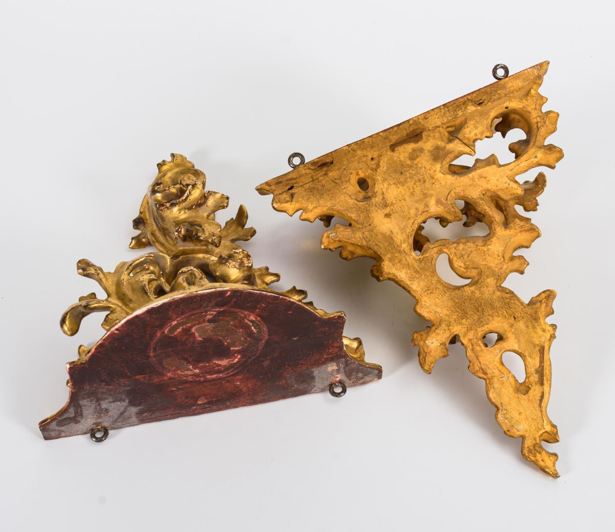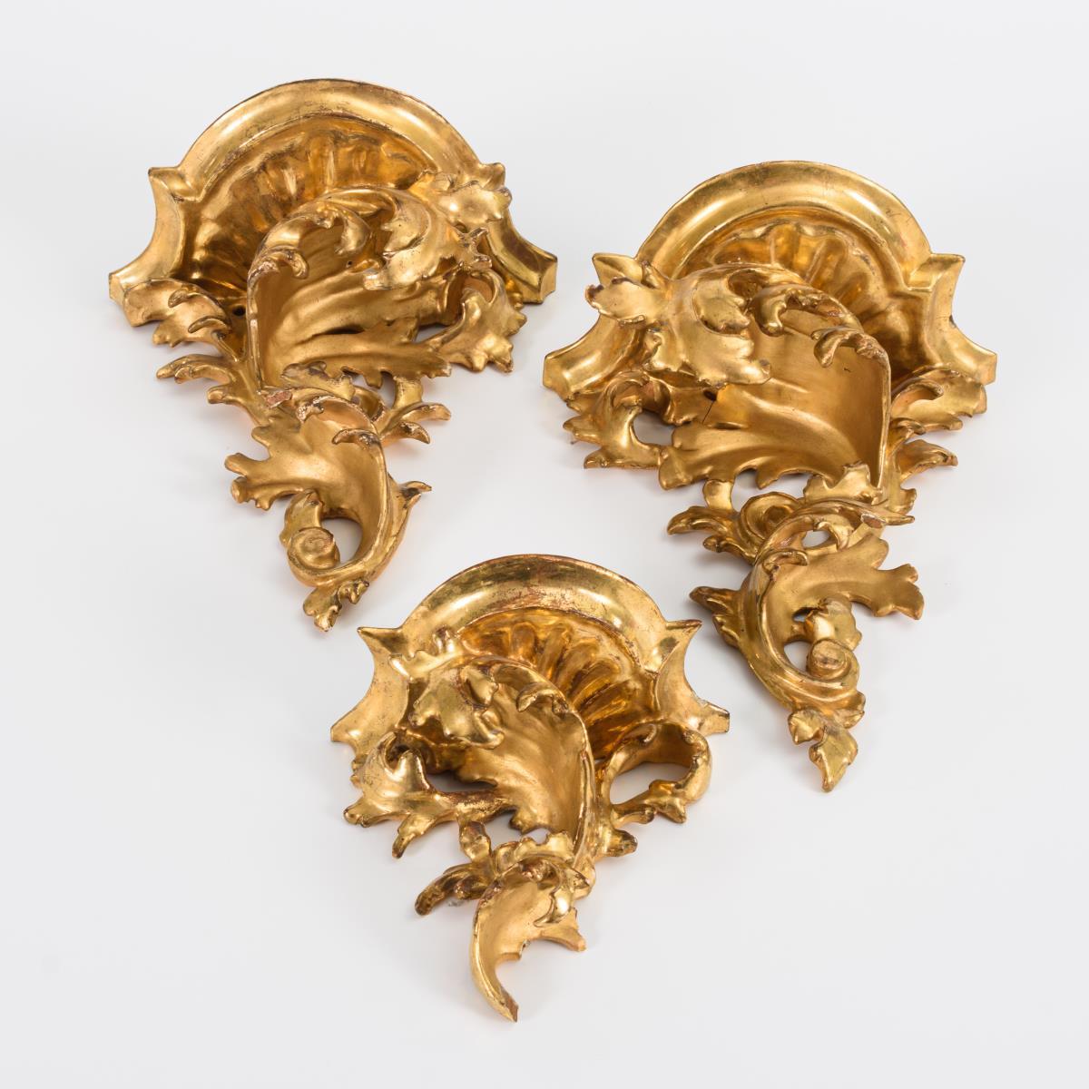 Geschnitzter Satz gleicher Konsolen mit rocailleartig gerollten Blättern; darunter 1 Paar. Etwas berieben, minimale Fehlstellen, 1 kleiner Riss.