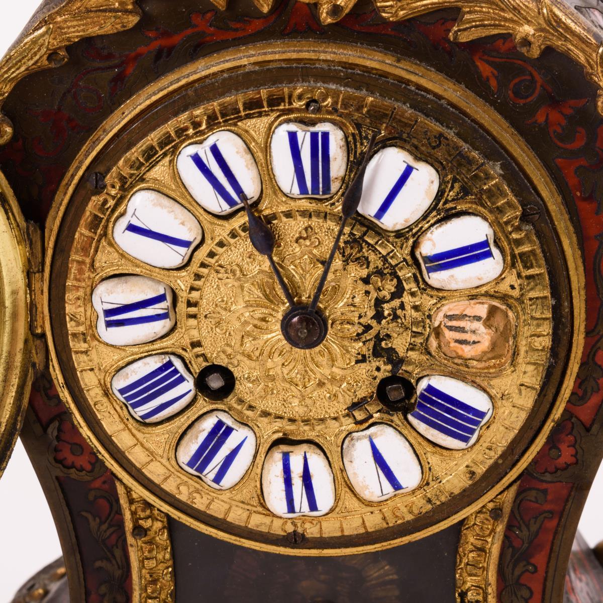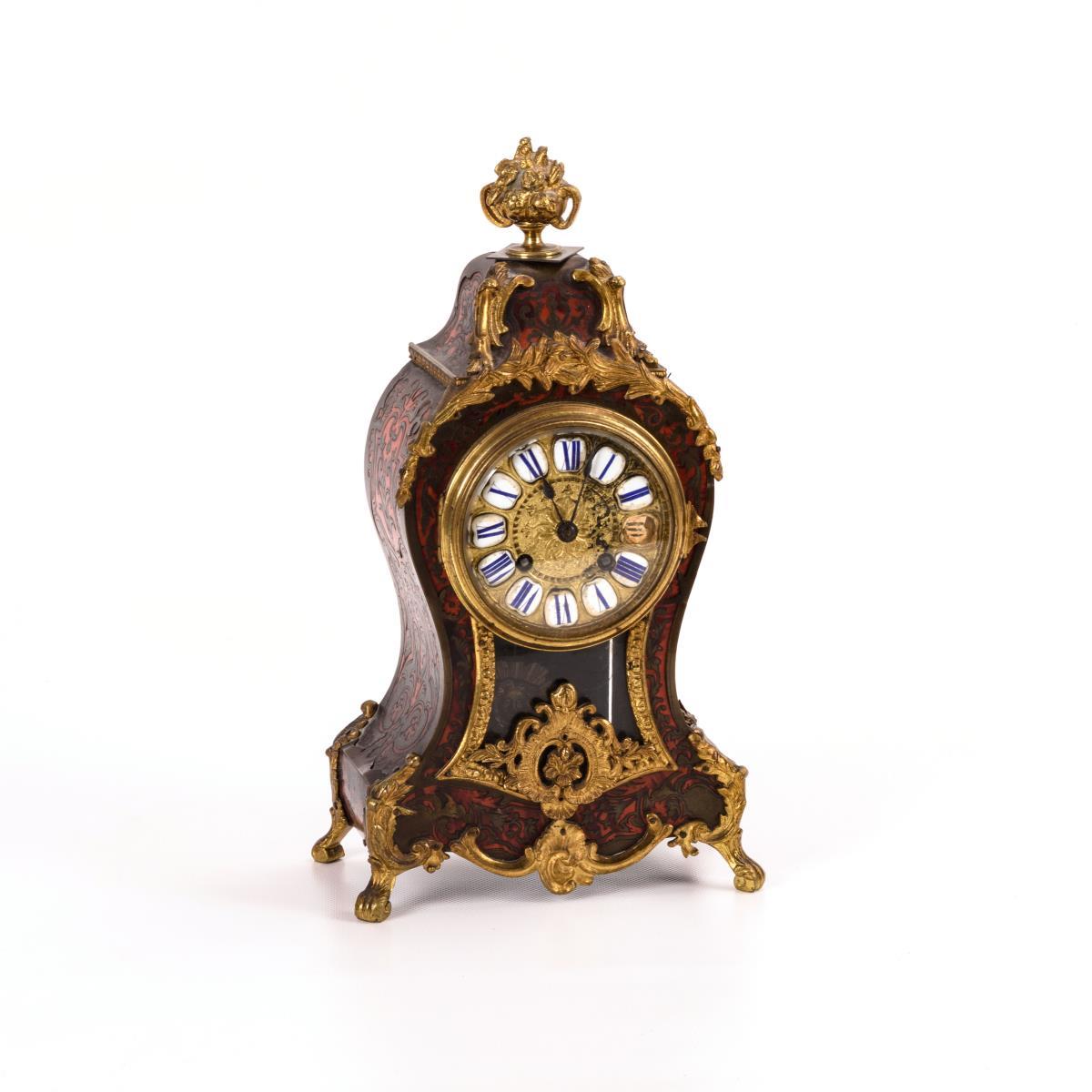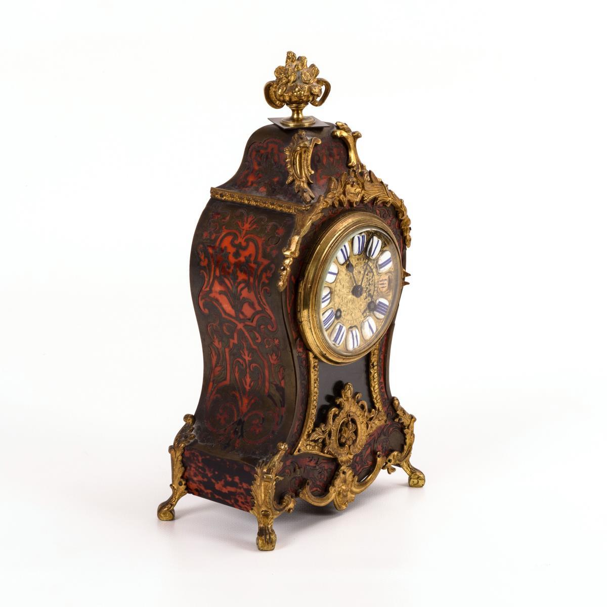 Tailliertes Gehäuse mit floralen Marketerien im Boulle-Stil und Beschlägen mit Rocaillezier, schauseitige Pendelsicht. Gehwerk läuft, Schlagwerk defekt. Alters- und Gebrauchsspuren, teils Fehlstellen und Defekte in der Marketerie, loser Bekrönungszapfen.