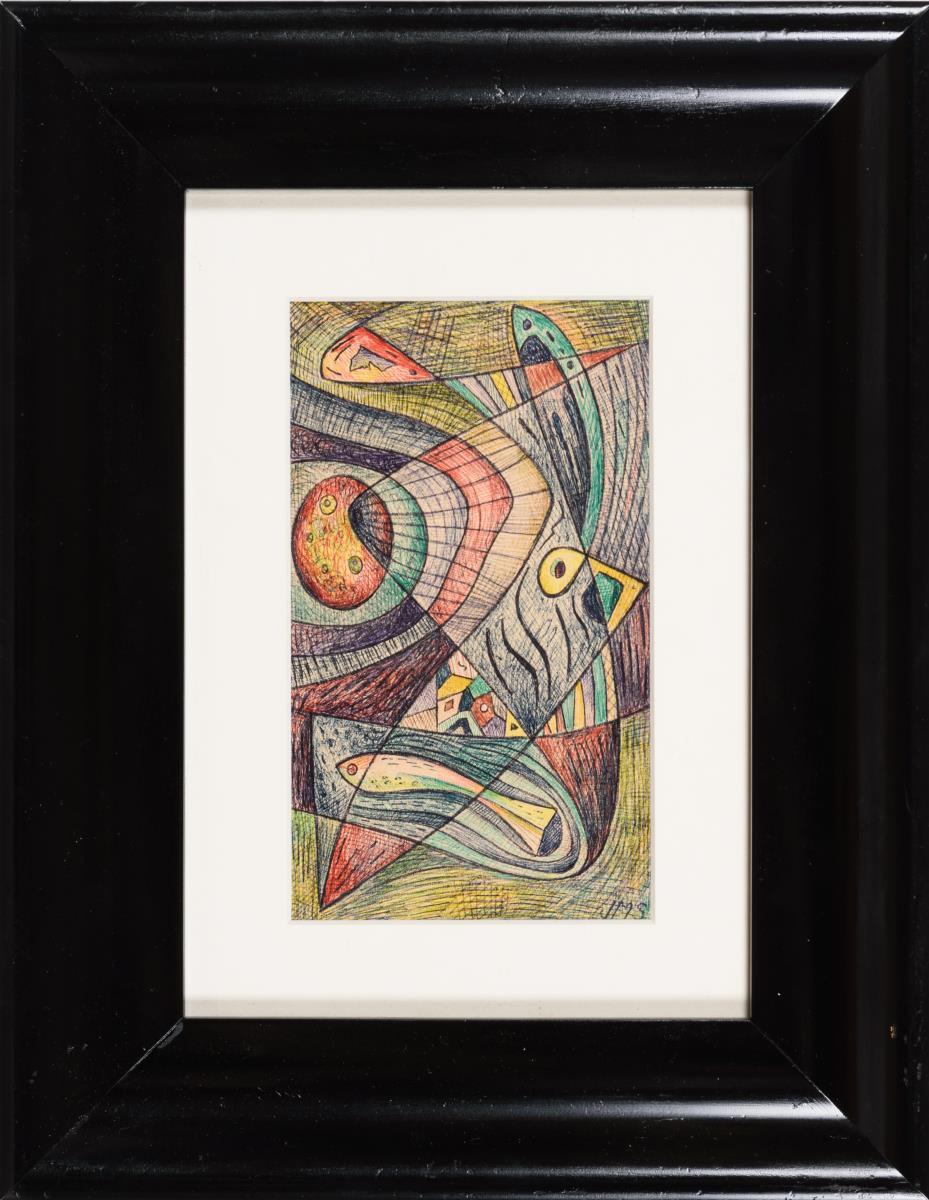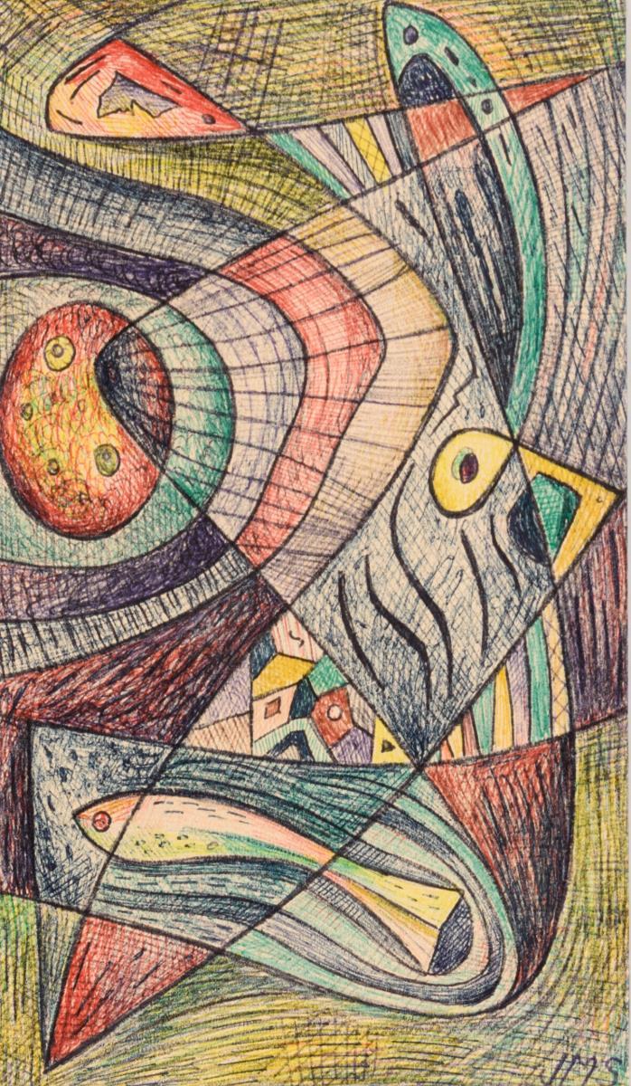Vielfarbige Komposition mit fischartiger Figur.
