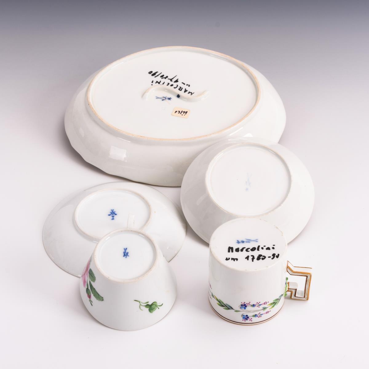 2x Schwertermarke mit Stern, Marcolini-Zeit, 1774-1814: Zylindertasse (H 6,5 cm) und Untertasse (Ø 12,5 cm) mit Vergißmeinnichtmalerei sowie der Bezeichnung "Freundschaftliches Andenken" im Untertassenspiegel. Ovalschale "Neuozier" mit korallenroter Blumenmalerei (L 22,5 cm). / 1x Knaufschwerter "I", um 1820: konische Tasse (H 5 cm) und Untertasse (Ø 13 cm) mit dem gemalten Dekor "Rote Rose". Partieller Goldabrieb, herstellungsbedingte Glasurunregelmäßigkeiten an der Biedermeier-Untertasse.