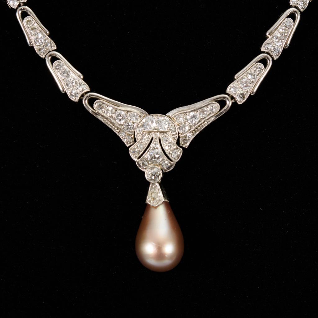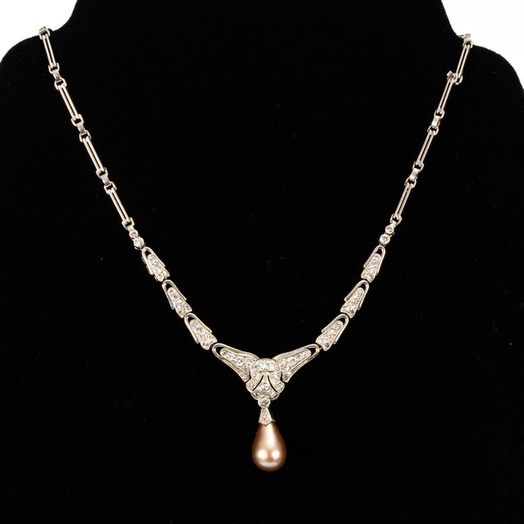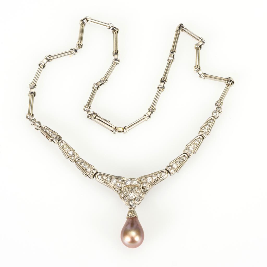 Art-Déco-Collier mit Altschliff-Brillanten, Brillanten, Diamanten und Zuchtperle