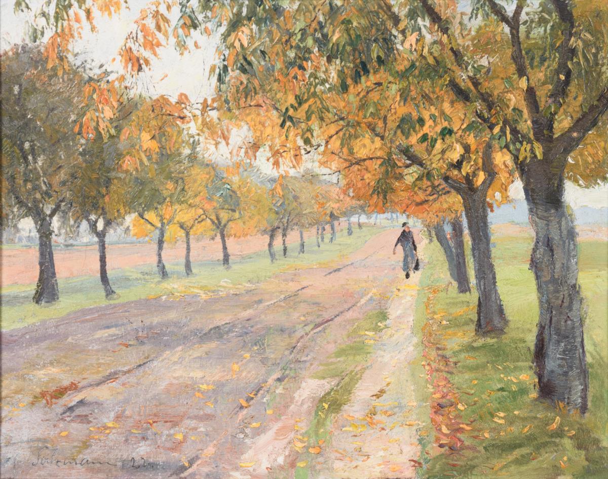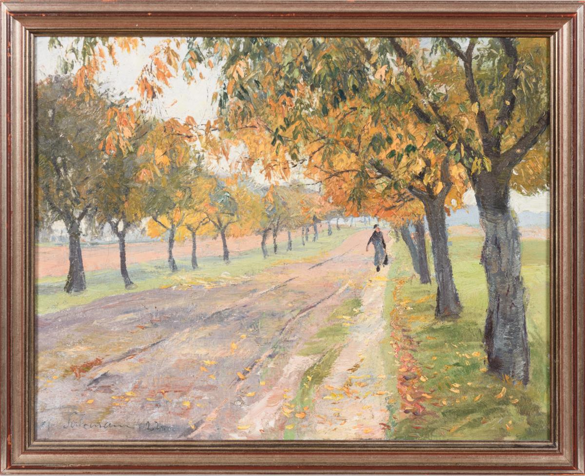 Staffagefigur auf der Straße zwischen den herbstlich verfärbten Bäumen.