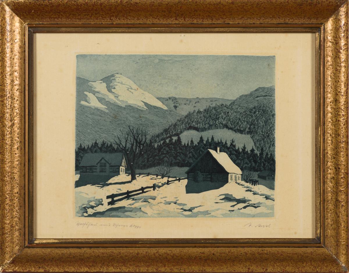 Ansicht des winterlichen Wolfshau im Riesengebirge. Etwas stockfleckig.
