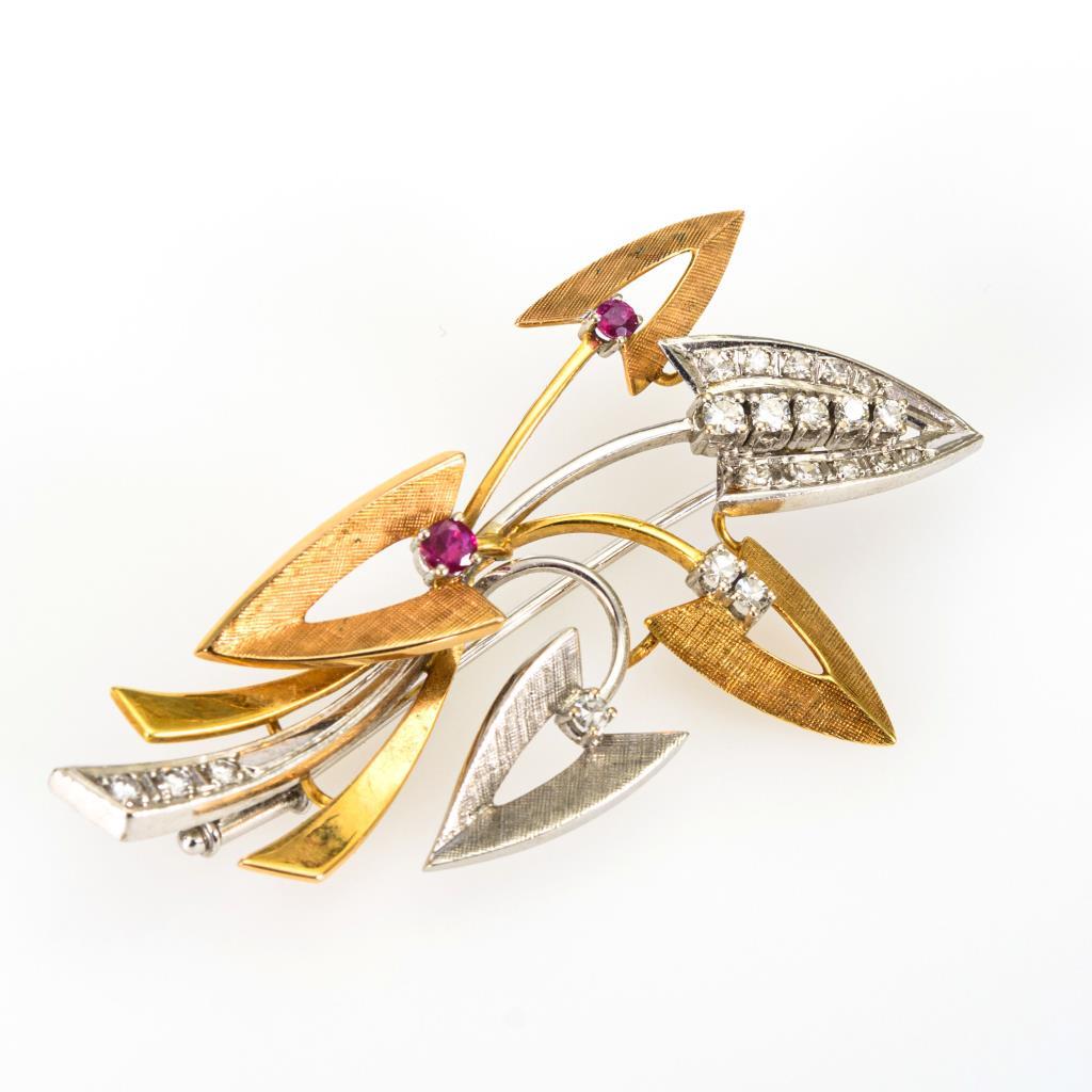 Stilisierter Blumenstrauß mit 2 kleinen Rubinen, 8 Brillanten und 13 Diamanten. Schiebehaken.