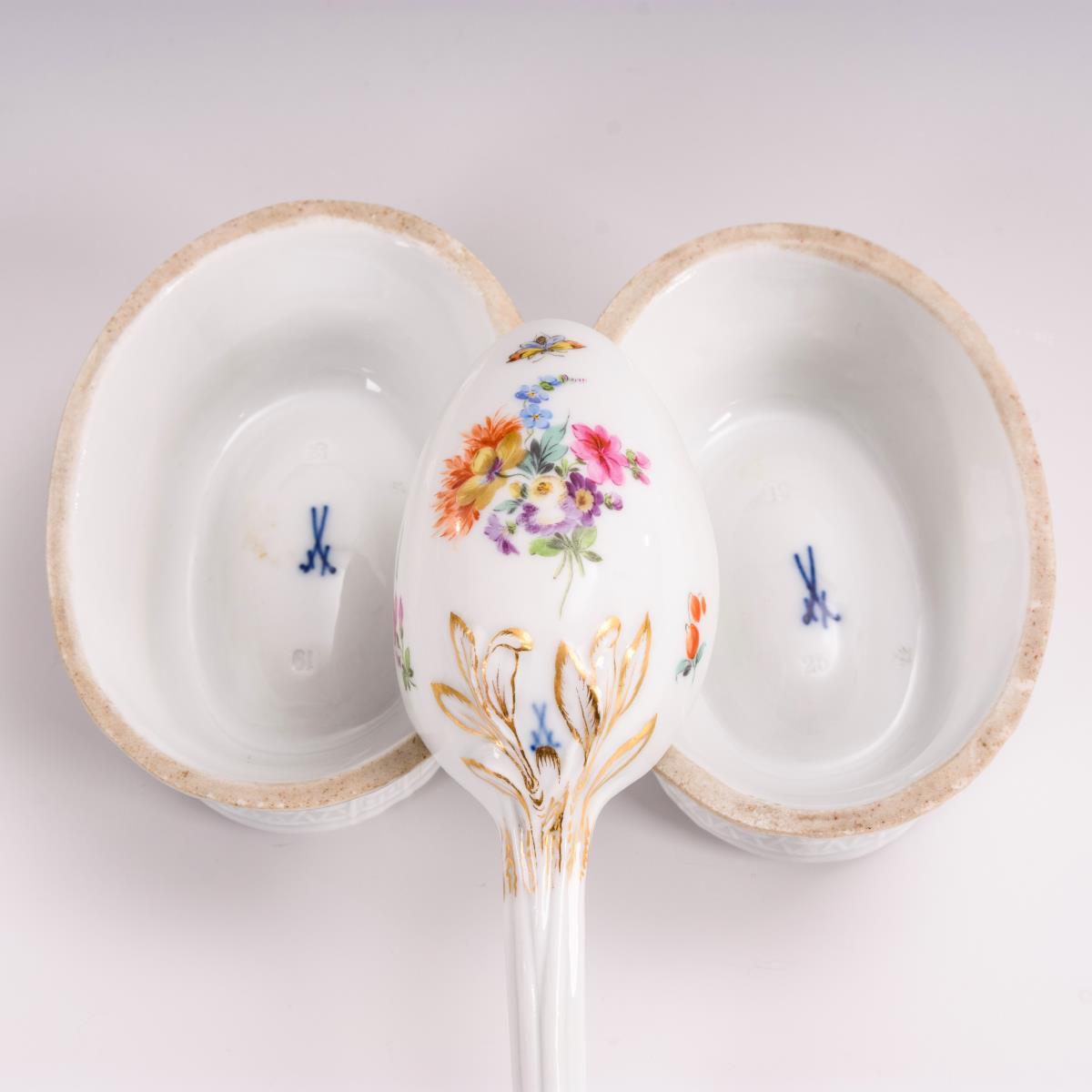 2 Salieren und Servierlöffel mit Blumen- und Insektenmalerei. Meissen.