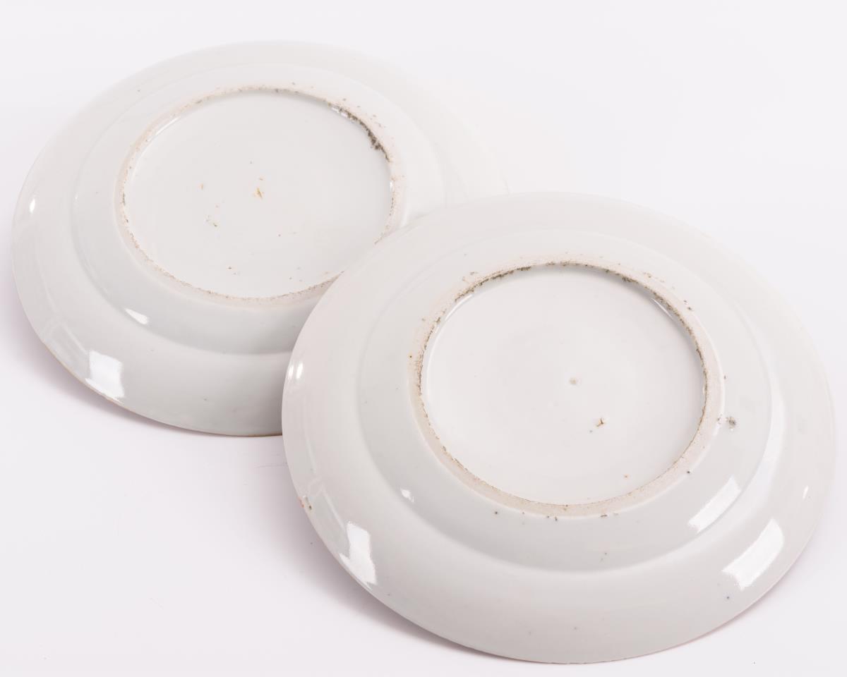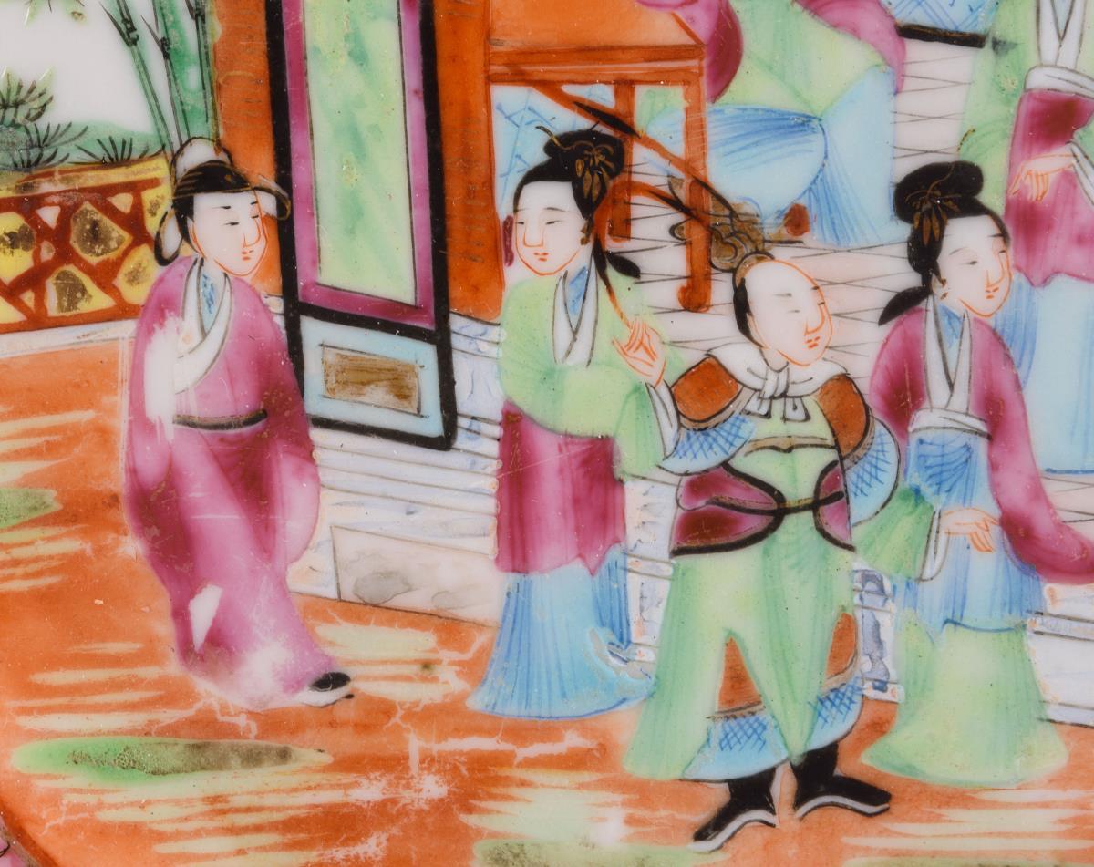 Im Dekor ähnliche Teller mit Figurengruppen vor und in einem Haus. Rand mit dichtem Blütenornament und Schmetterlingen. Goldrand schwach berieben, zwei sehr kleine Chips.