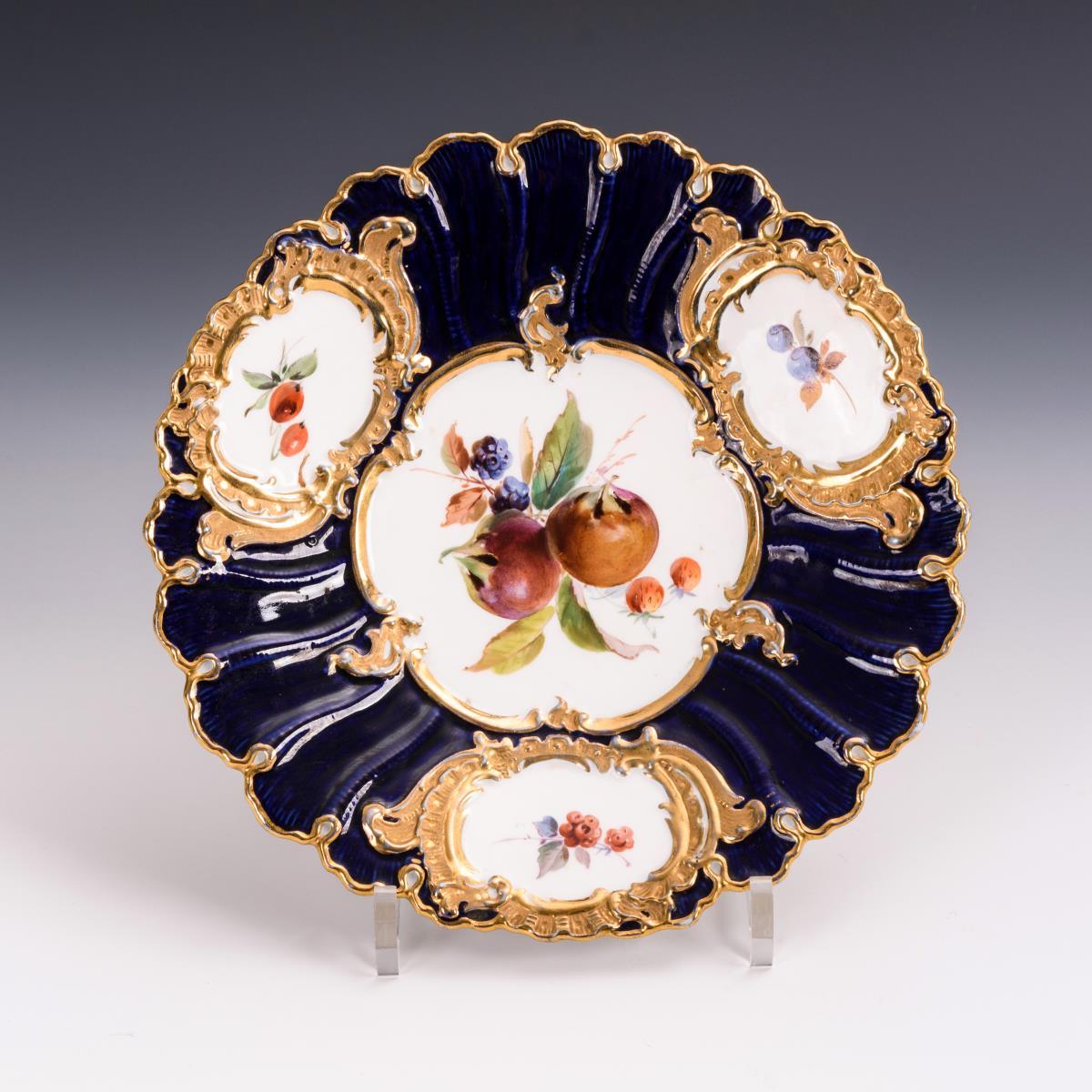 Kobaltblauer Teilfond, polychrome Fruchtmalerei, Goldstaffage. Ø 23 cm.