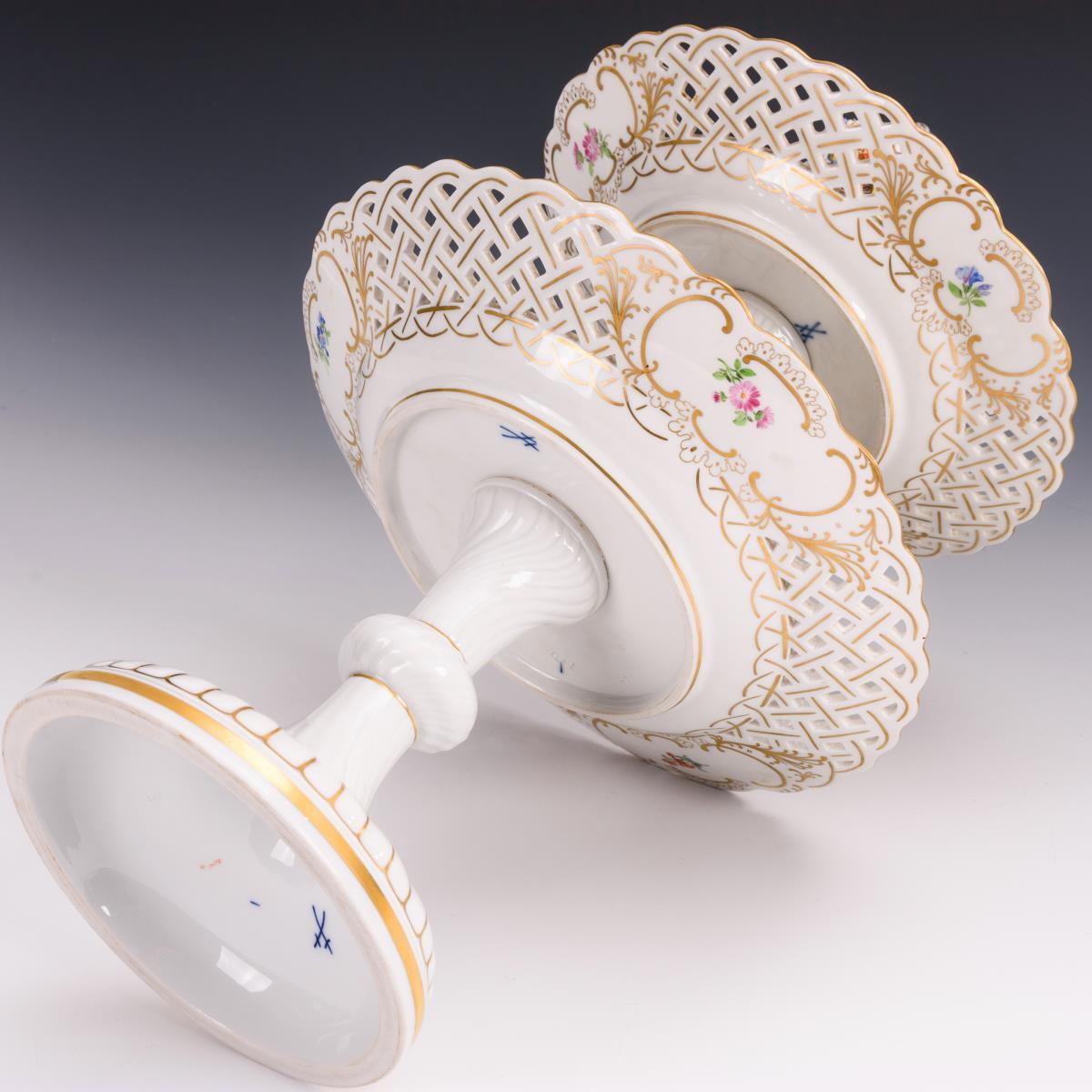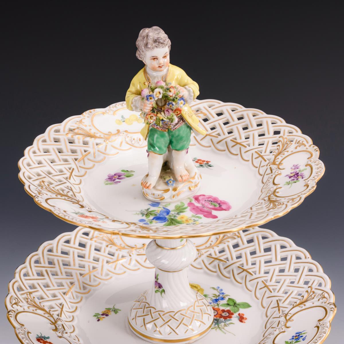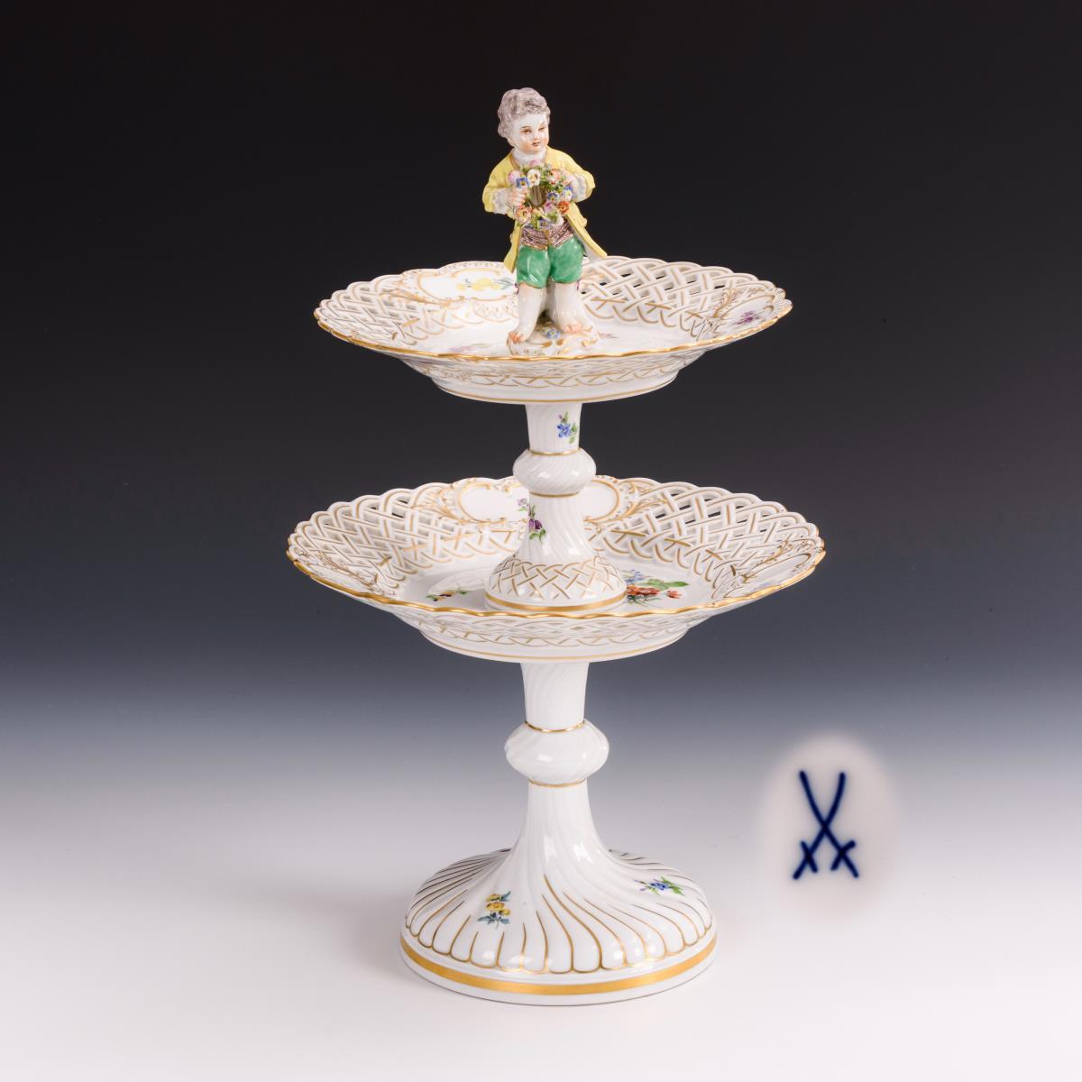 Tafelaufsatz mit zwei Durchbruchtellern und einem Gärtnerknaben mit Blumenkranz. Blumenkranz minimal bestoßen.