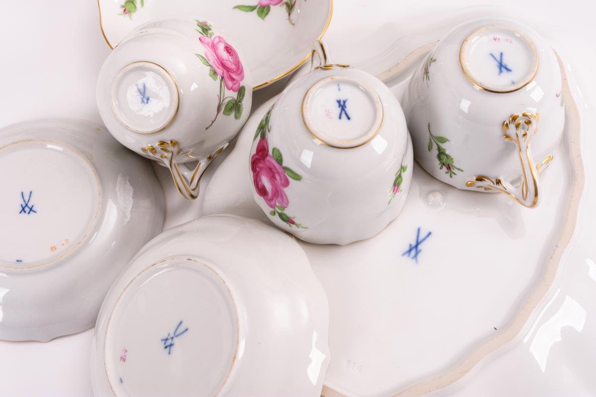 6 Mokkatassen, Zuckerdöschen und Schale "Rote Rose". Meissen.