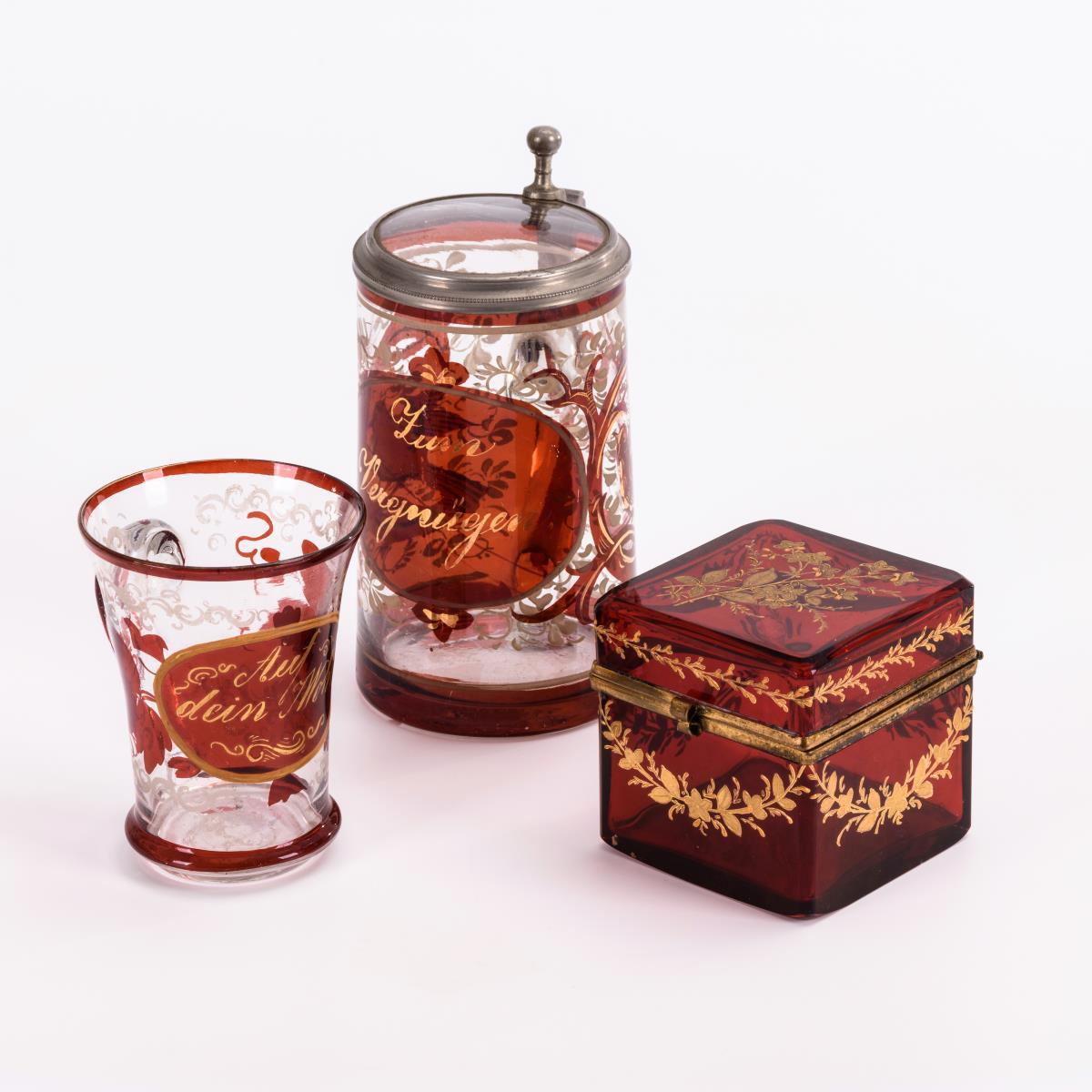 Henkelbecher mit der Aufschrift "Auf dein Wohl" (H 10,5 cm), konischer Bierkrug mit zinnmontiertem Scharnierdeckel und der schauseitigen Aufschrift "Zum Vergnügen" (H 16,5 cm) und quadratische Dose mit metallmontiertem Scharnierdeckel und reliefgoldgemalten Festons (8 x 8 x 8 cm). Minimale Bestoßung am Dosenstand.