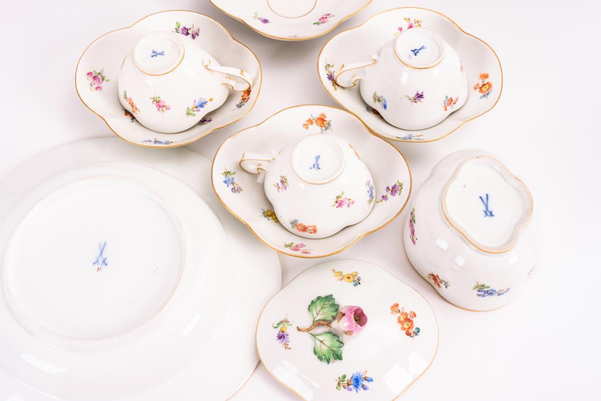4 Mokkatassen, Zuckerdose und Suppenteller. Meissen.