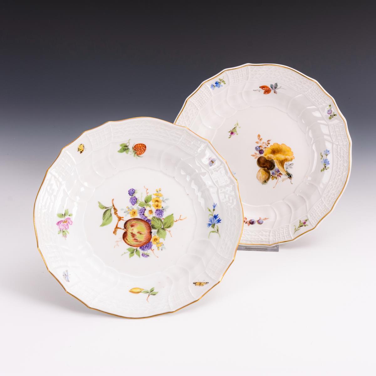 Form "Neubrandenstein". 1x bemalt mit einem Fruchtbukett mit Pfifferling, Steinpilz und Heidelbeeren im Stil der Weichmalerei. / 1x ein Fruchtbukett mit Apfel und Brombeeren (dieser Teller Hausmalerei).