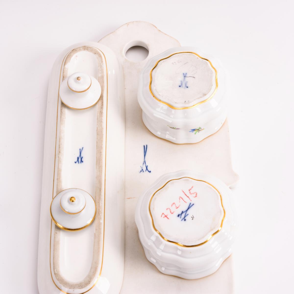 Frühstücksbrett, 2 Tintenfässer und Schreibschale. Meissen.