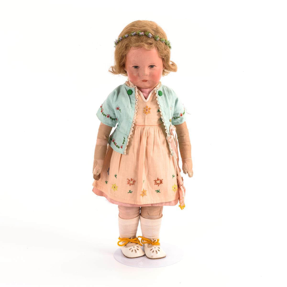 Festgenähter Stoffkopf mit maskenartig bemaltem Gesicht und blonder, handgeknüpfter Perücke. Schlanker Körper mit Schlenkerarmen, Beine mit Scheibengelenken. Rosa Kleid, grünes Jäckchen, weiße Schuhe, Haarkränzchen. Gesicht wohl partiell überarbeitet, Körper leicht verschmutzt, Arme und 1 Bein mit Heftpflaster repariert.