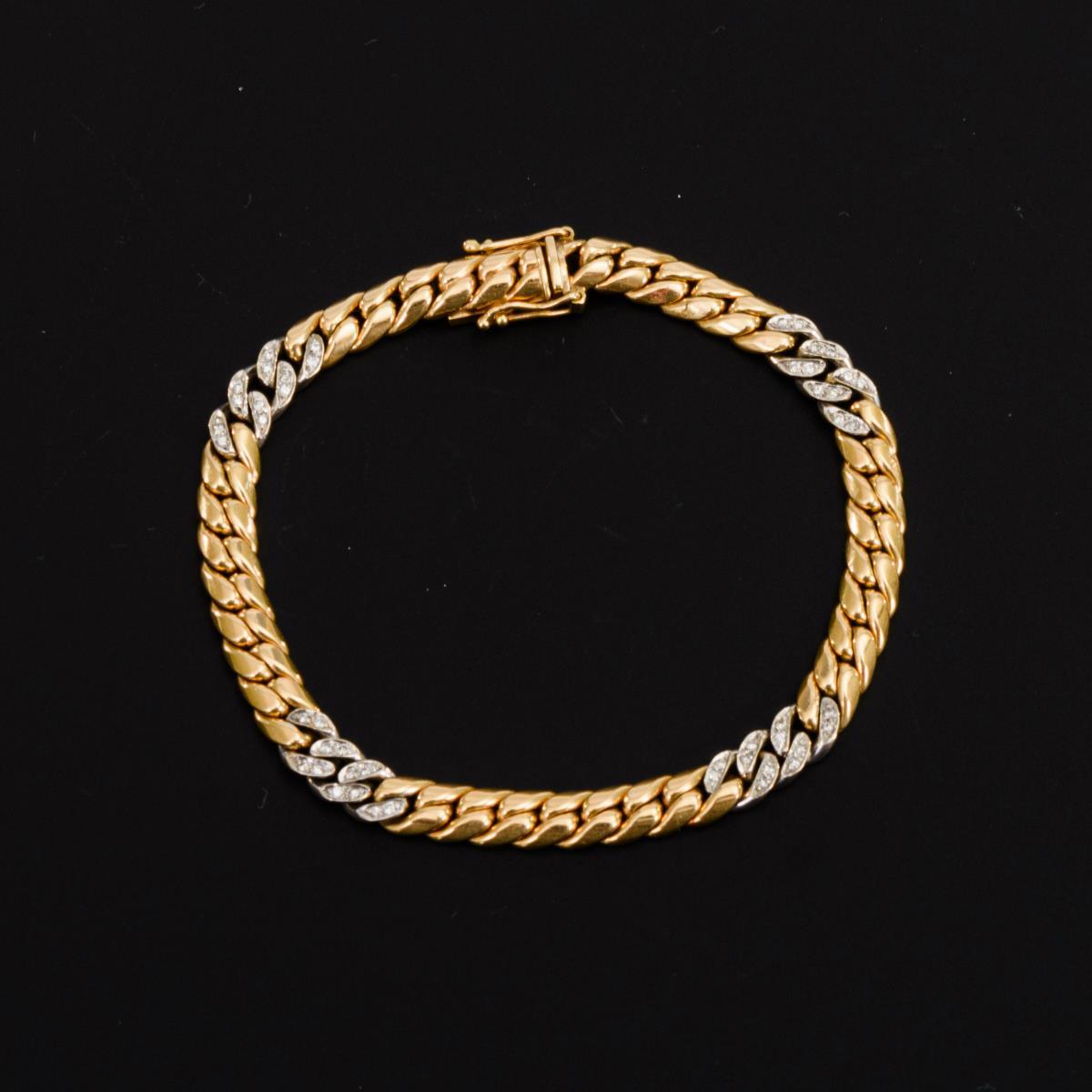 Gelbgold/Weißgold 585 gestempelt. Brillanten zus. 0,24 ct. 19 x 0,6 cm. 14,8 g.