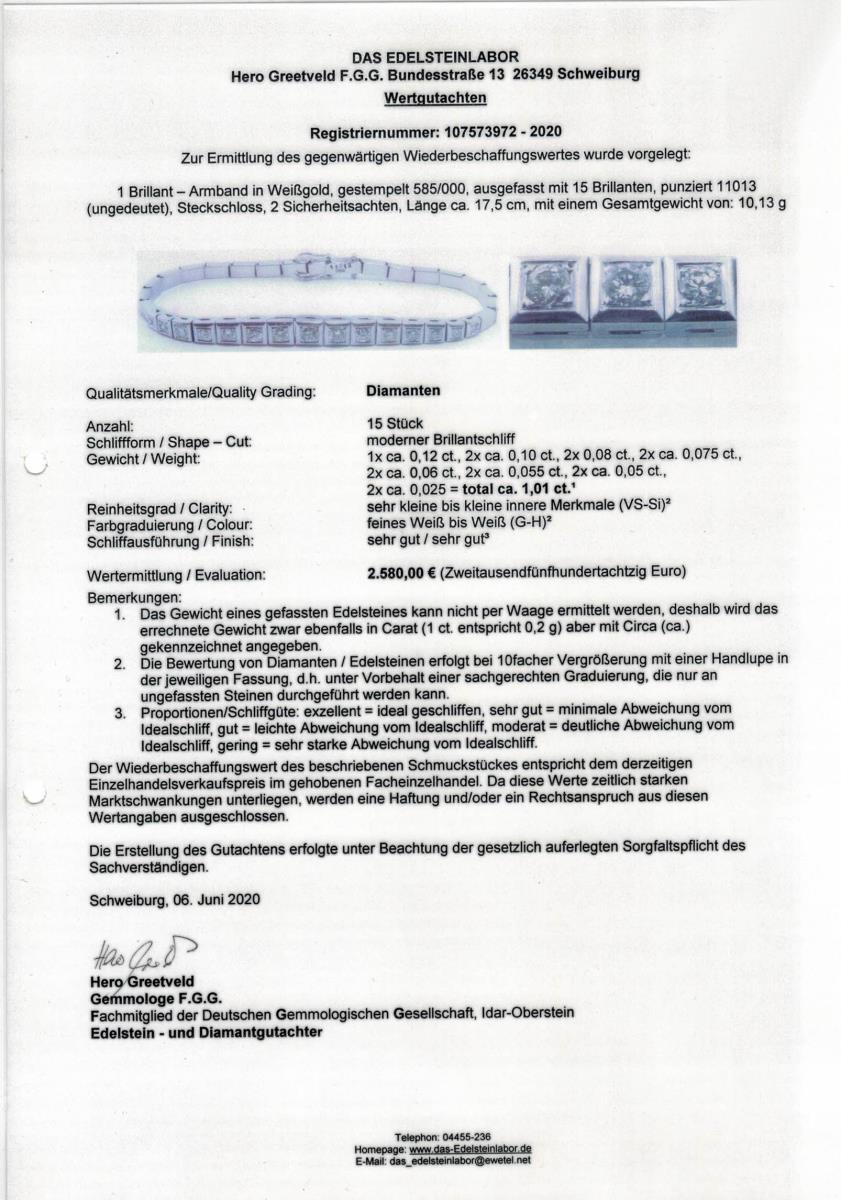 Weißgold 585 gestempelt. Brillanten zus. ca. 1,01 ct. G-H/vs-si. L 17,5 cm. 10,13 g.