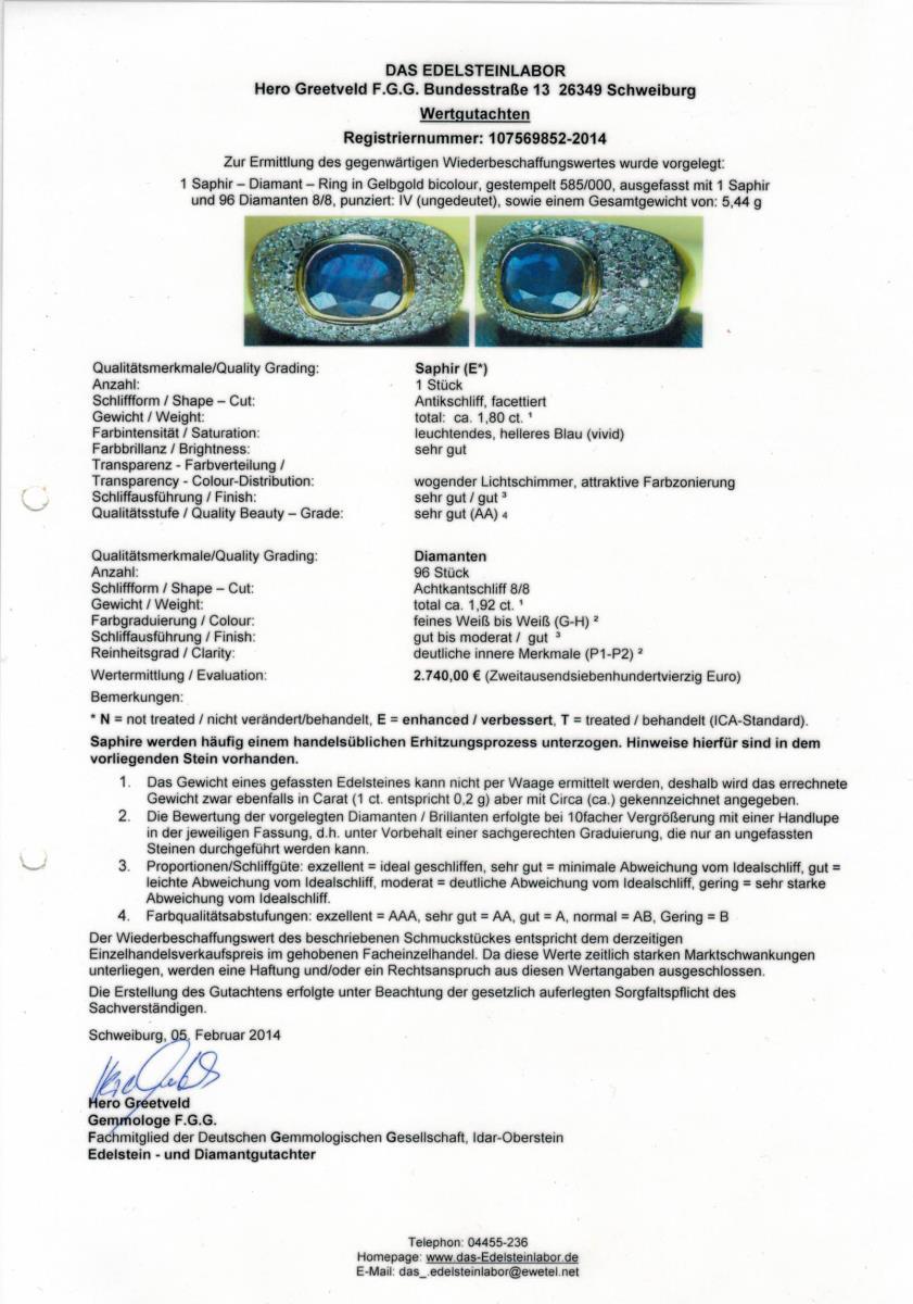 Gelbgold 585 gestempelt. Saphir ca. 1,80 ct. Diamanten zus. ca. 1,92 ct. G-H/PI-PII. Ringgröße 54. 5,44 g.