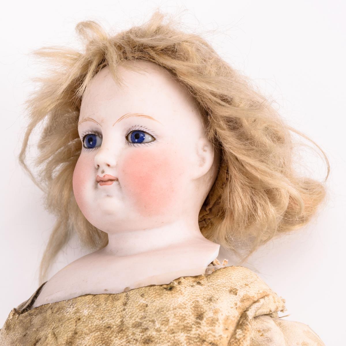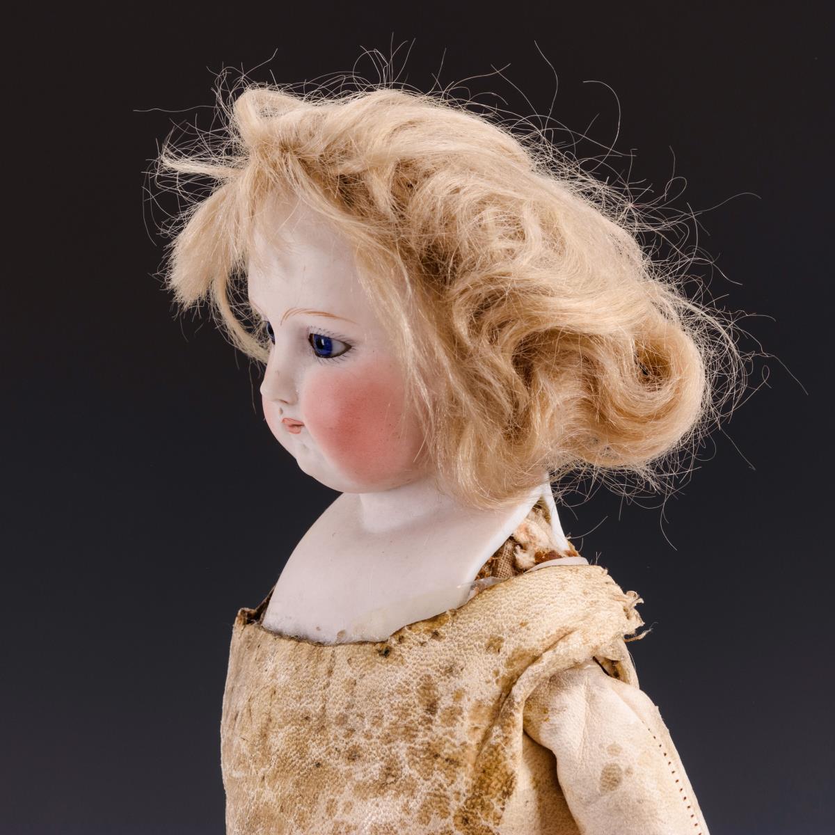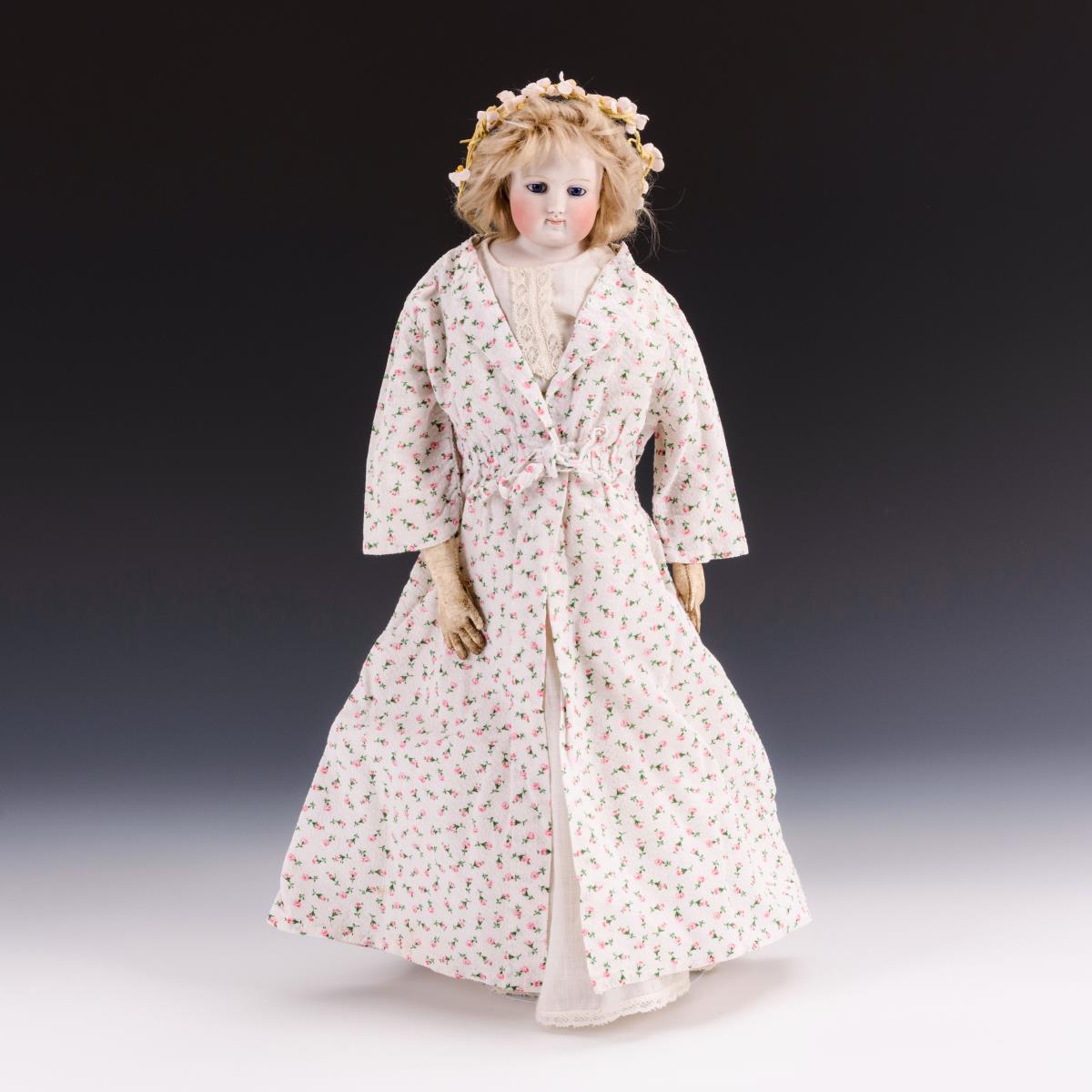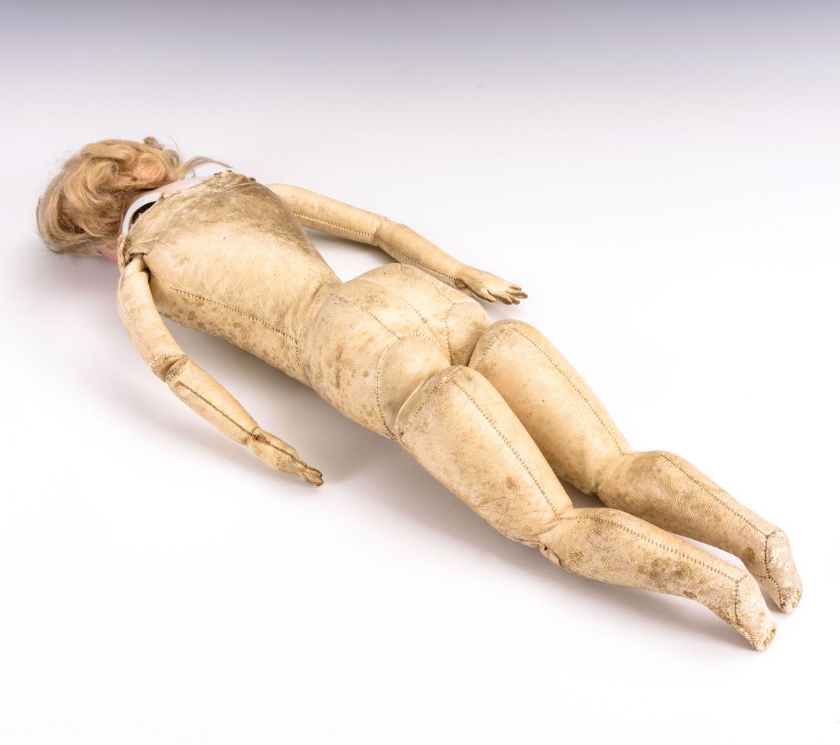 Defekter Kopf mit festen blauen Augen und blonder Mohairperücke, geschlossener Mund mit konturierten Lippen. Ganzlederkörper mit Zwickeln an Ellenbogen, Po und Knien. Alte Unterwäsche, Morgenrock mit Streuröschen. Ausbruch an der Brustplatte links, linkes Knie alt repariert.