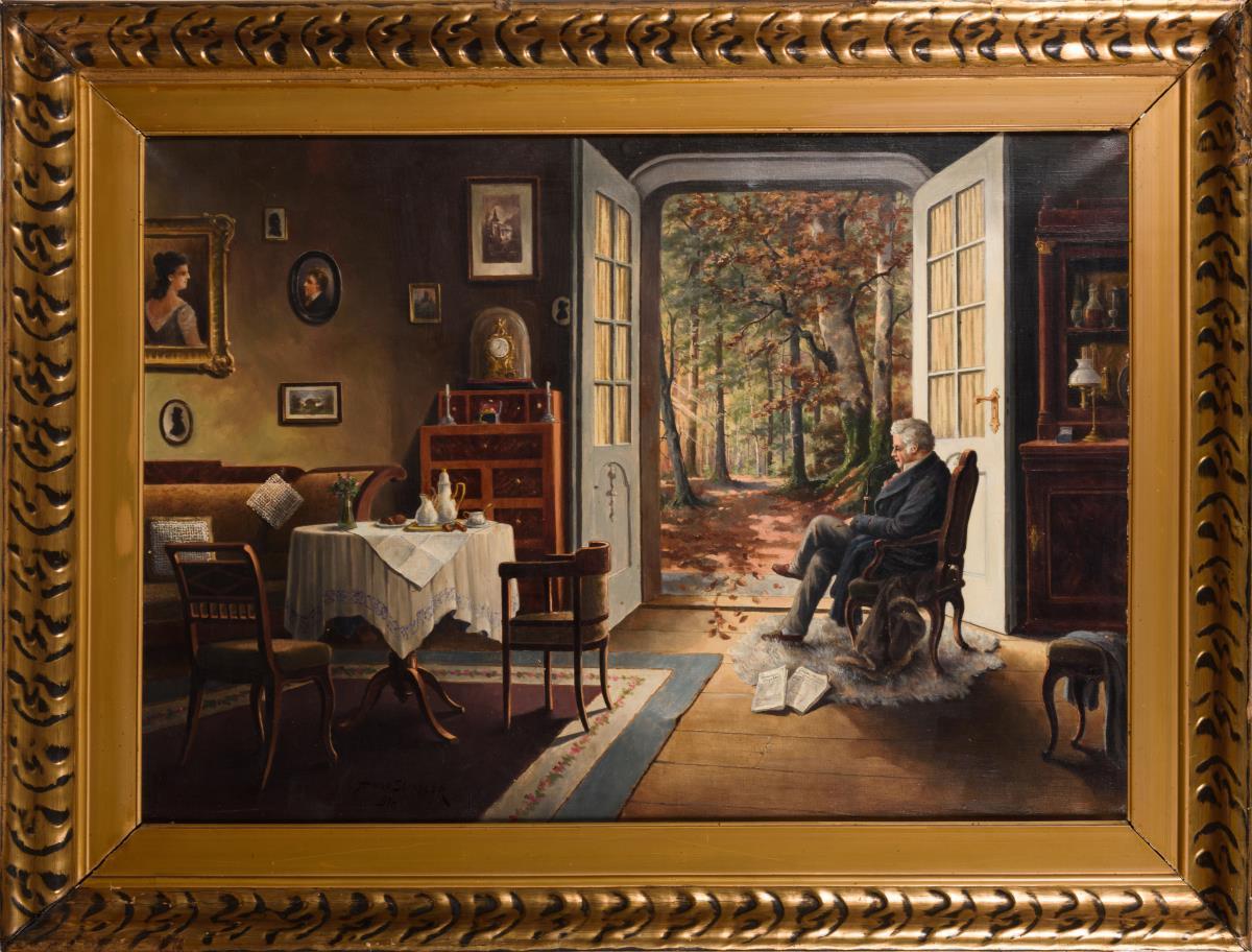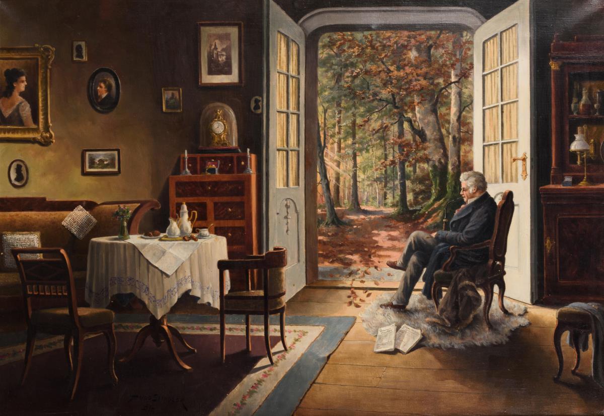 Der alte Herr in der bürgerlichen Stube bei geöffneten Türen mit Blick in den Herbstwald.