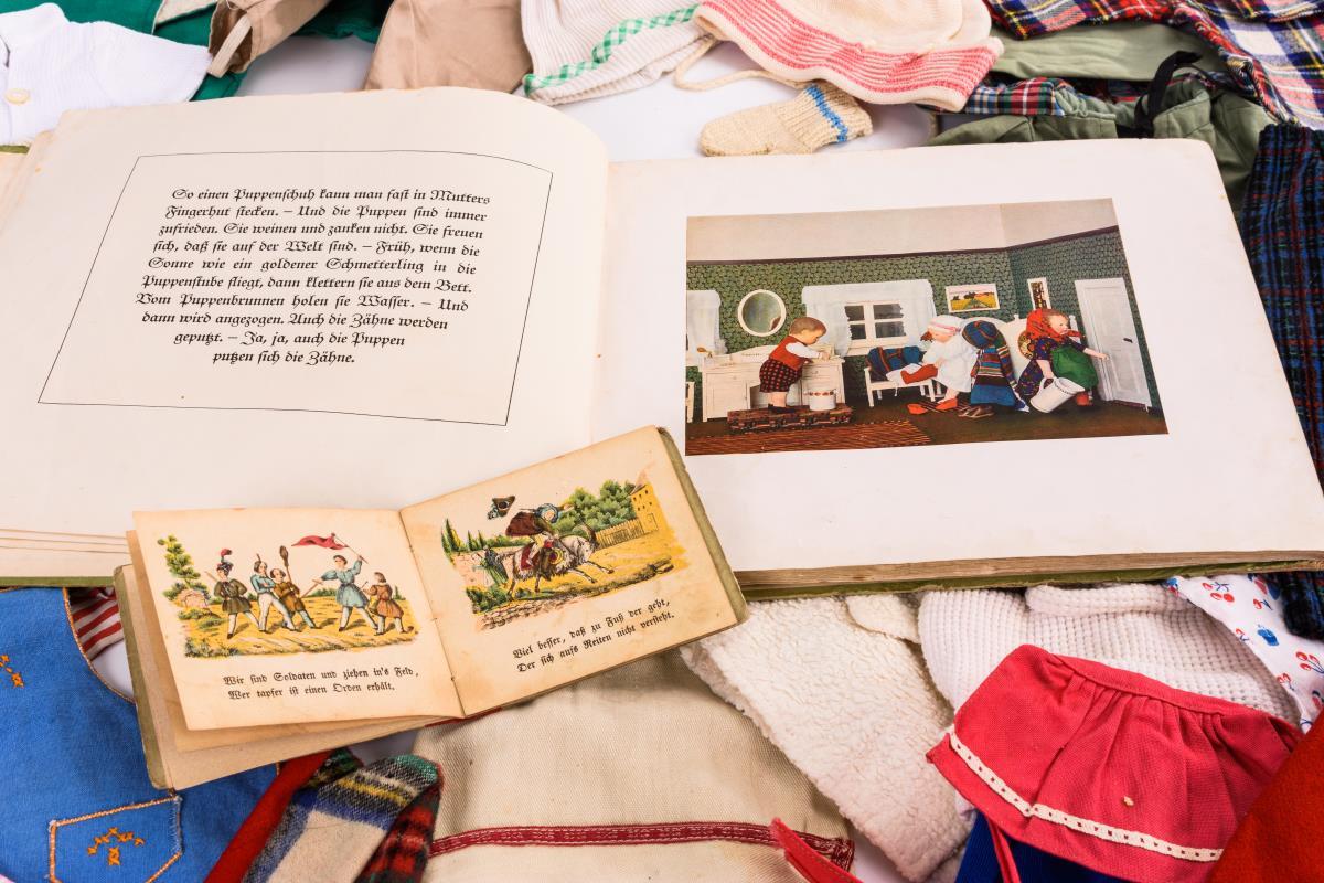 Käthe Kruse-Buch, Bilderbüchlein und Konvolut Kleidung für Käthe-Kruse-Puppen.