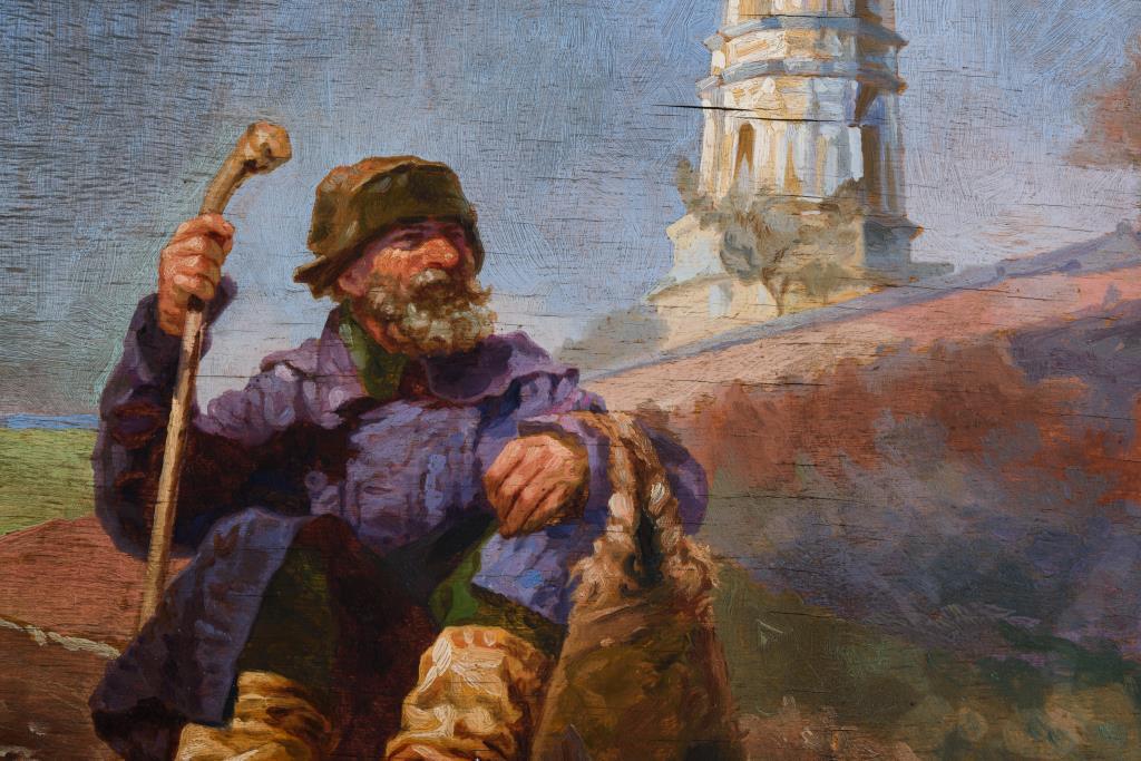 Älterer Mann mit Wanderstab im Sonnenschein vor dem Eingang des Klosters.