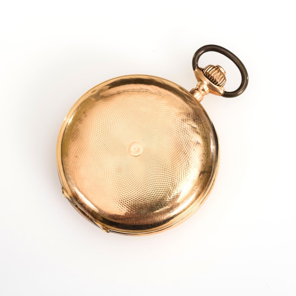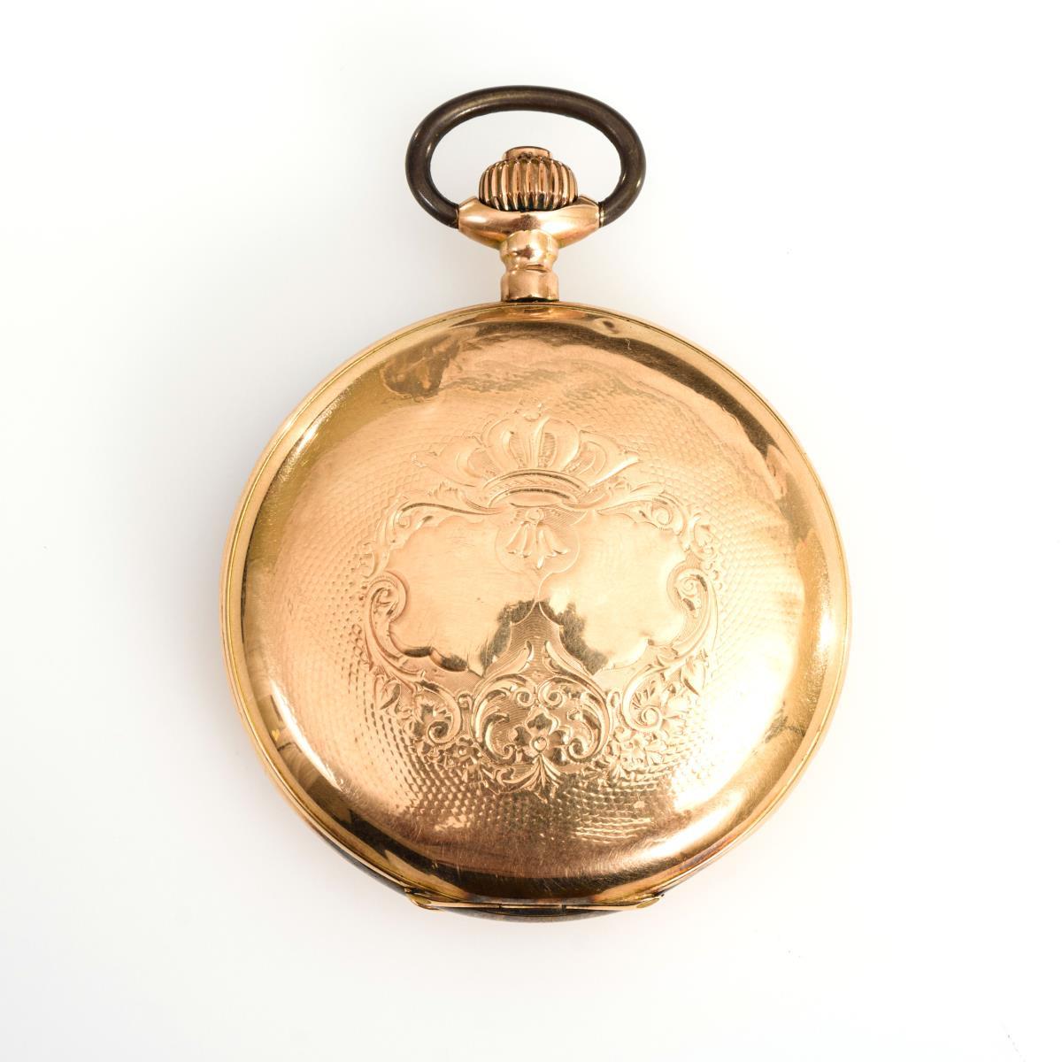 585 RG, Feingehaltsstempel, Schweizer Beschauzeichen gepunzt, Staubdeckel aus Metall. Ø 5,6 cm. 108 g.