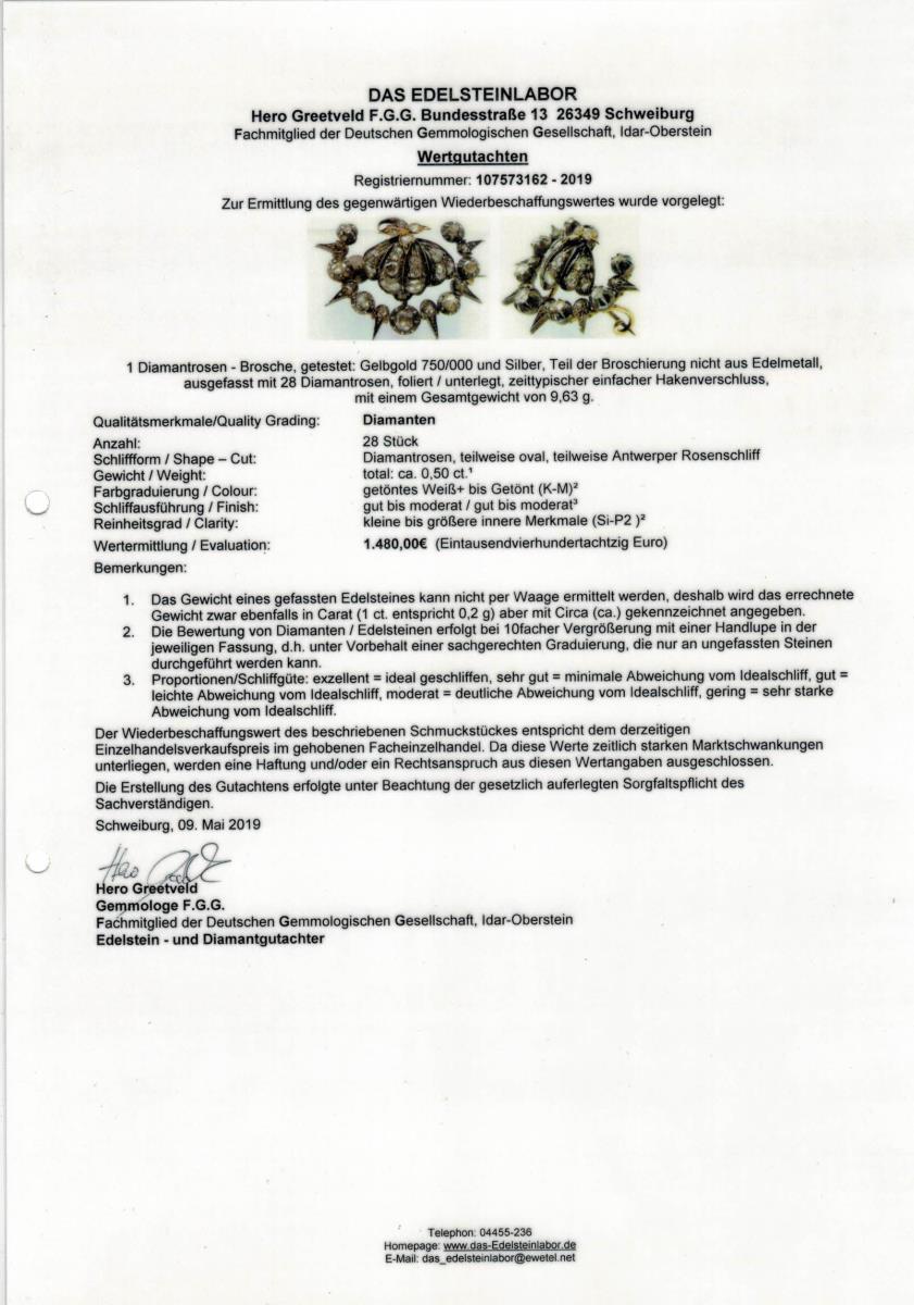 Kleine Brosche, besetzt mit 28 folienunterlegten Diamanten (teilweise Antwerpener Rosenschliff). Hakenverschluss. Nadel ergänzt.