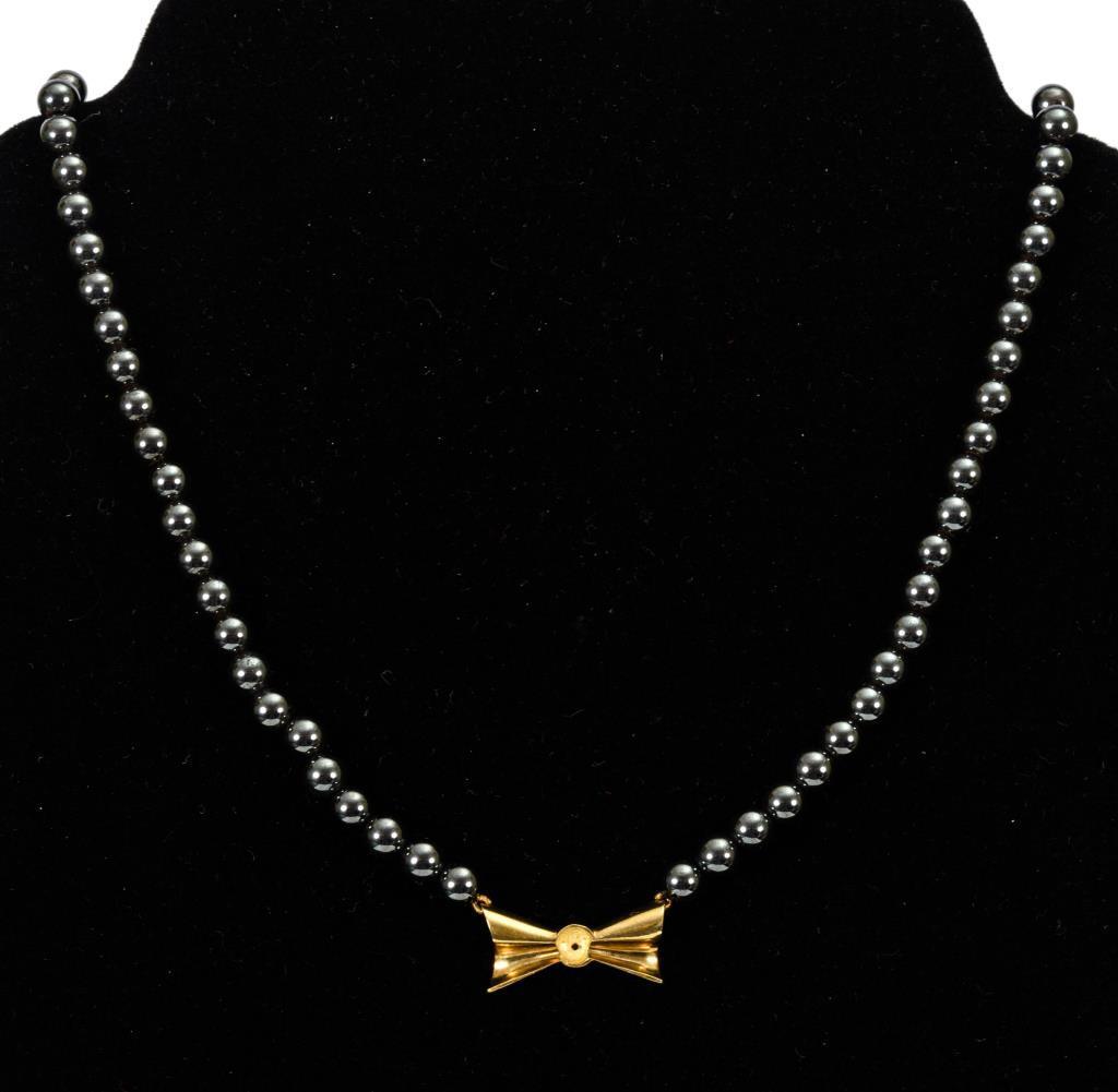 Schnürkette mit kleiner Zierschleife zwischen metallisch glänzenden Steinkugeln. Kugelschließe.