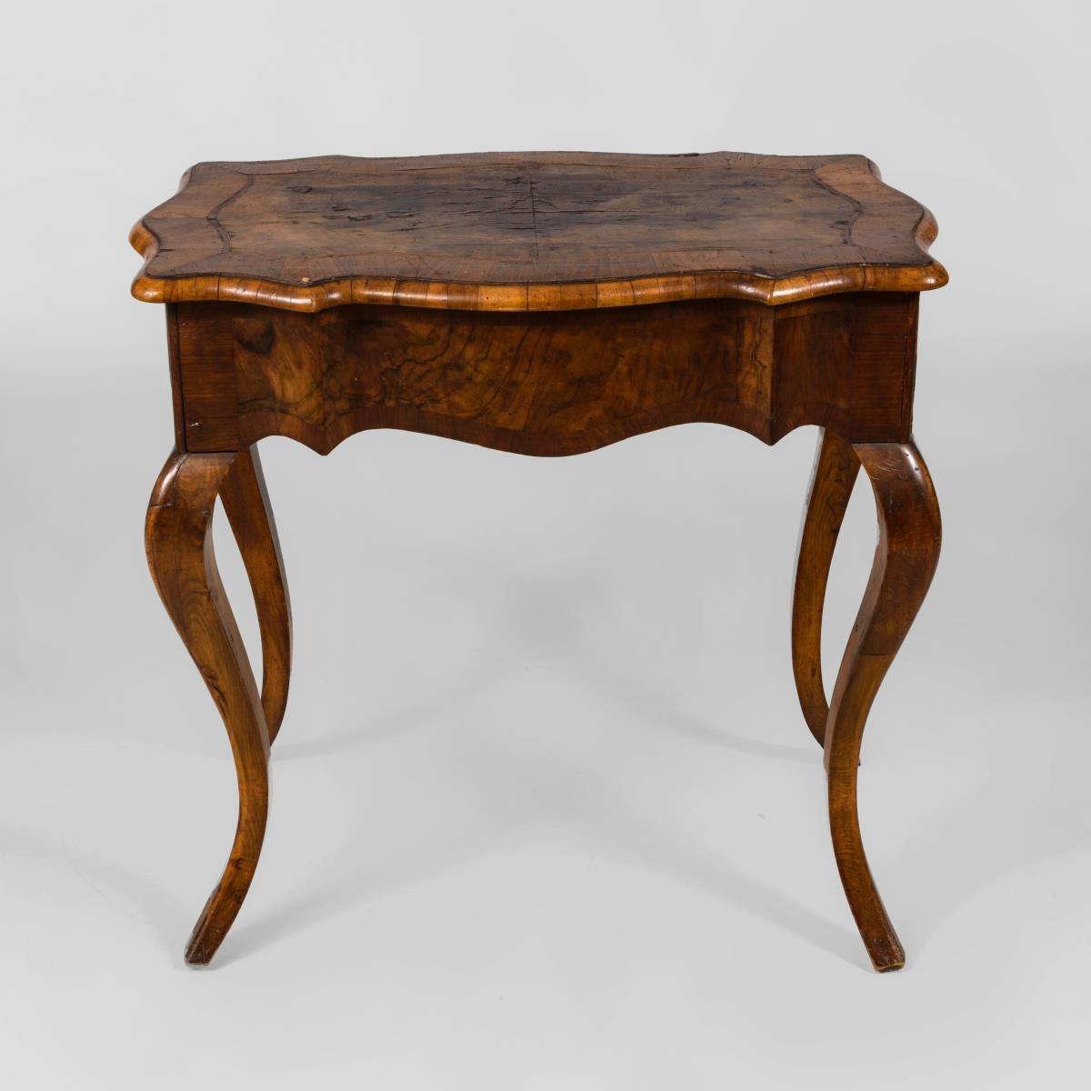 Kleiner Beistelltisch in stiltypisch geschwungener Form, mit geschweifter Zarge und 4 Konsol-Beinen. Tischplatte und Zarge dekoriert mit Maserfurnier. Furnier mit Defekten, restaurierungsbedürftig.