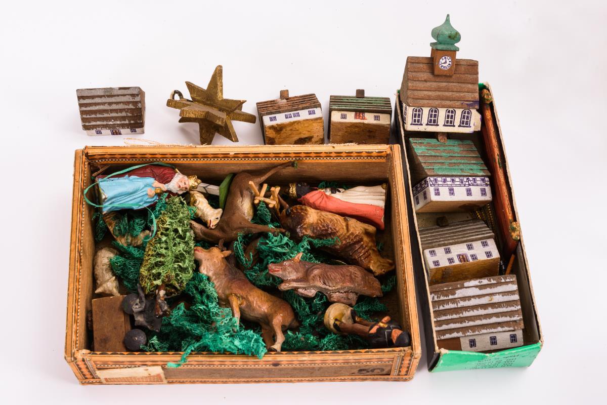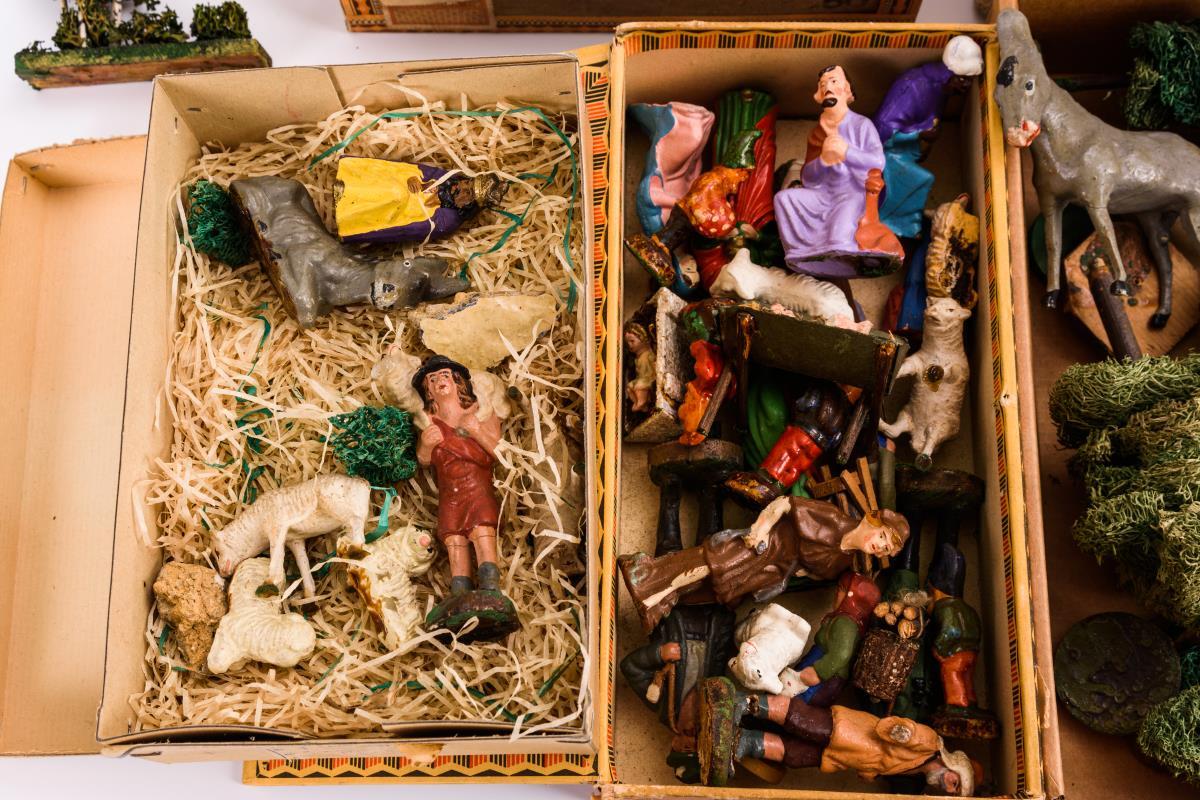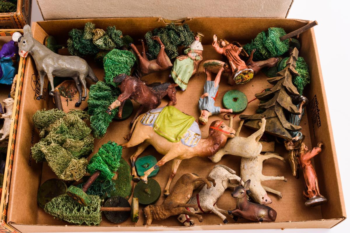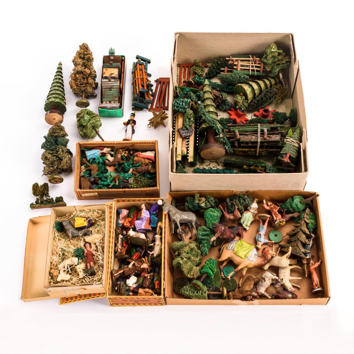 Zahlreiches Dekorationszubehör mit verschiedenen Krippenfiguren, Zwergen, Bäumen, Zäunen etc. Teils mit Altersspuren und Defekten.