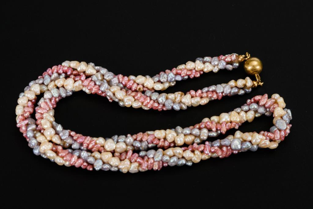 Schnürketten mit cremefarbenen, rosafarbenen und blaugrauen Zuchtperlen, an Kugelschloss.