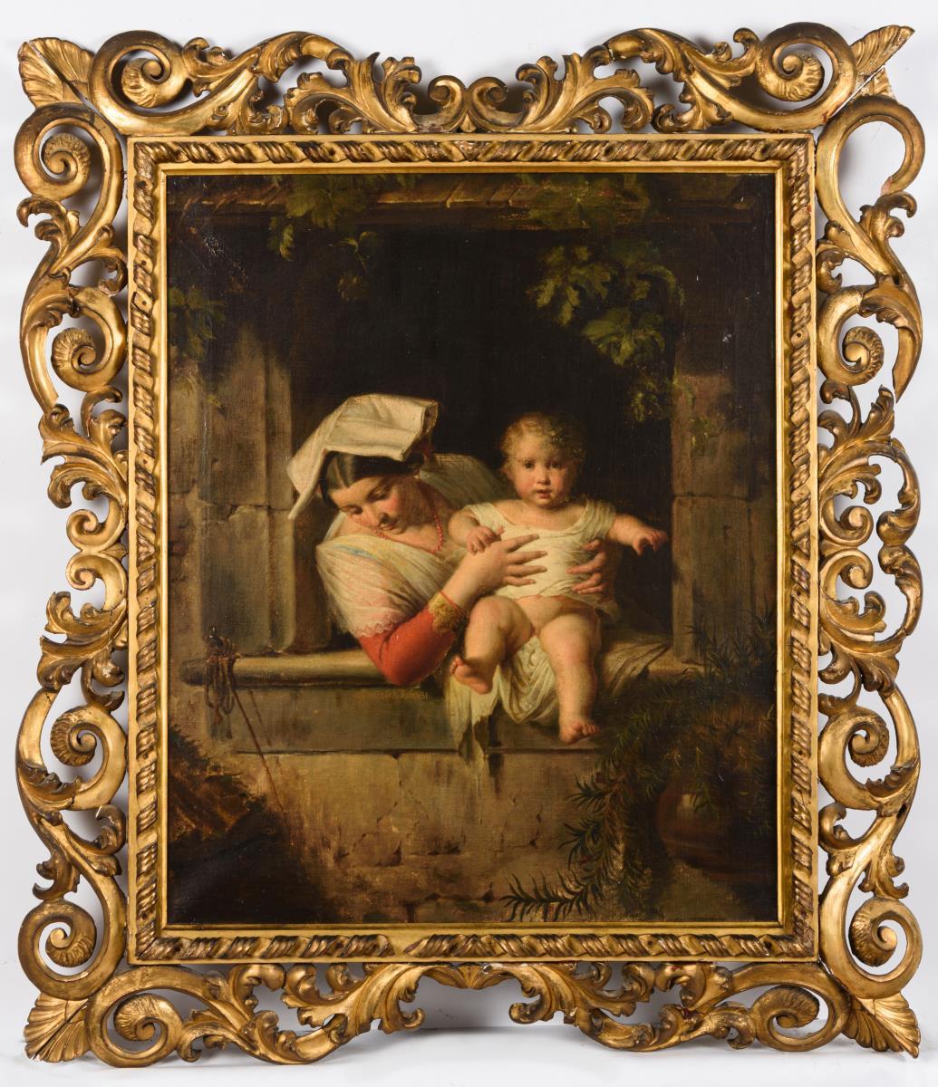 Die Mutter mit dem Kleinkind am Fenster im warmen Sonnenlicht. Leichte Altersspuren.