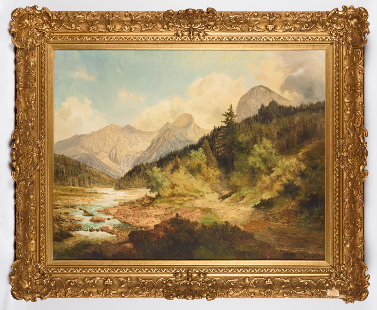 Alpenlandschaft mit Gebirgsfluss zwischen den Waldhängen vor der markanten Gebirgskette mit Arnspitze, Bettlerspitze und Ochsenkopf. Minimale Altersspuren.