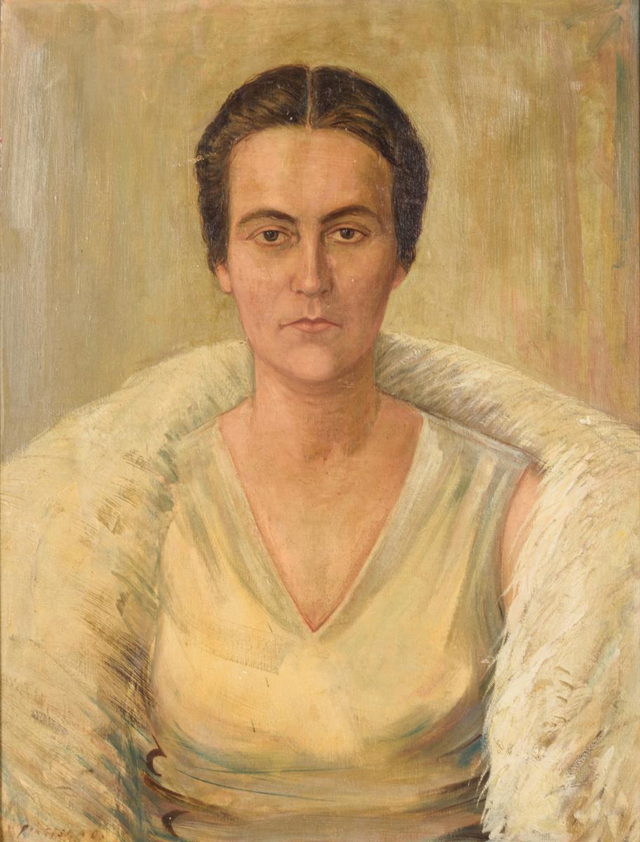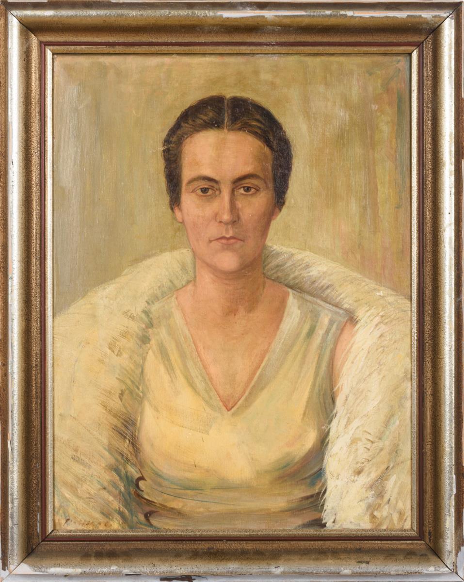 Frontales Bildnis einer jungen Frau im hellen Kleid mit weißem Mantel.