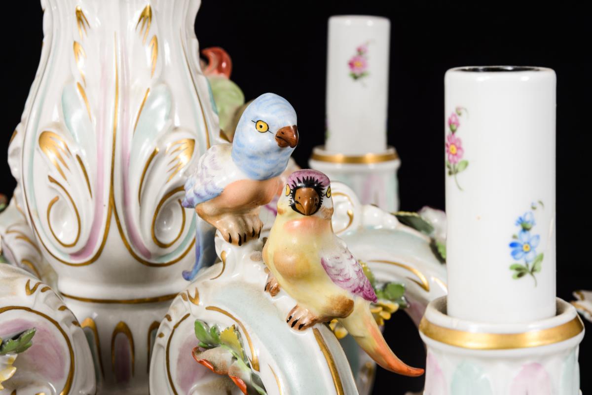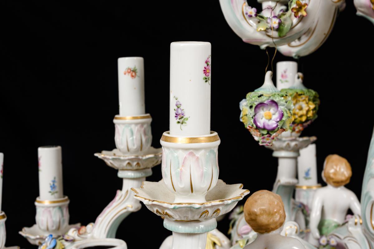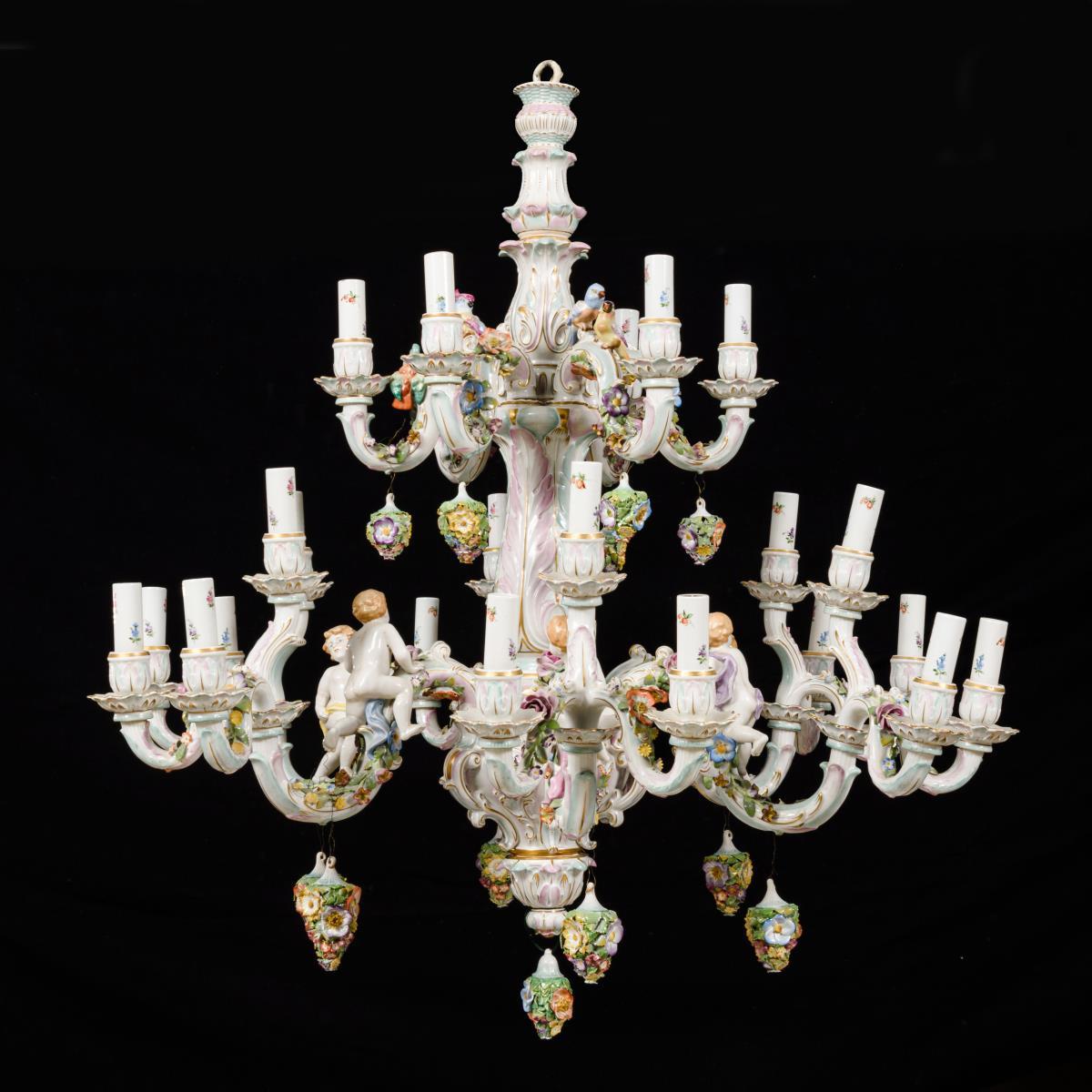 24-flammiger Leuchter mit 2x 6 s-förmigen Leuchterarmen an mehrgliedrigem Rocaillereliefschaft, mit elektrischen Tüllen. Mit reichem Blütenbelag, auf den Leuchterarmen sitzenden Putten und Papageienvögeln sowie 13 Blumenbuketts als Behang. 2 Blüten minimal bestoßen.