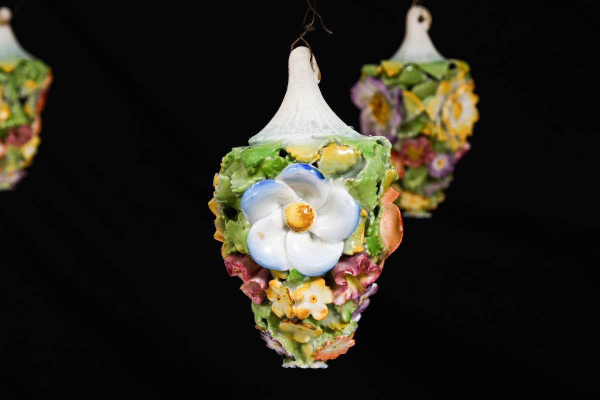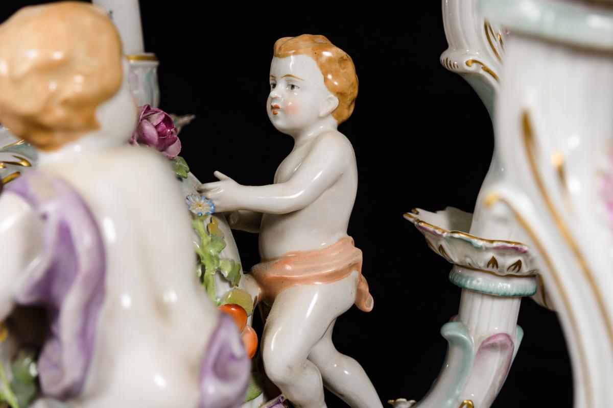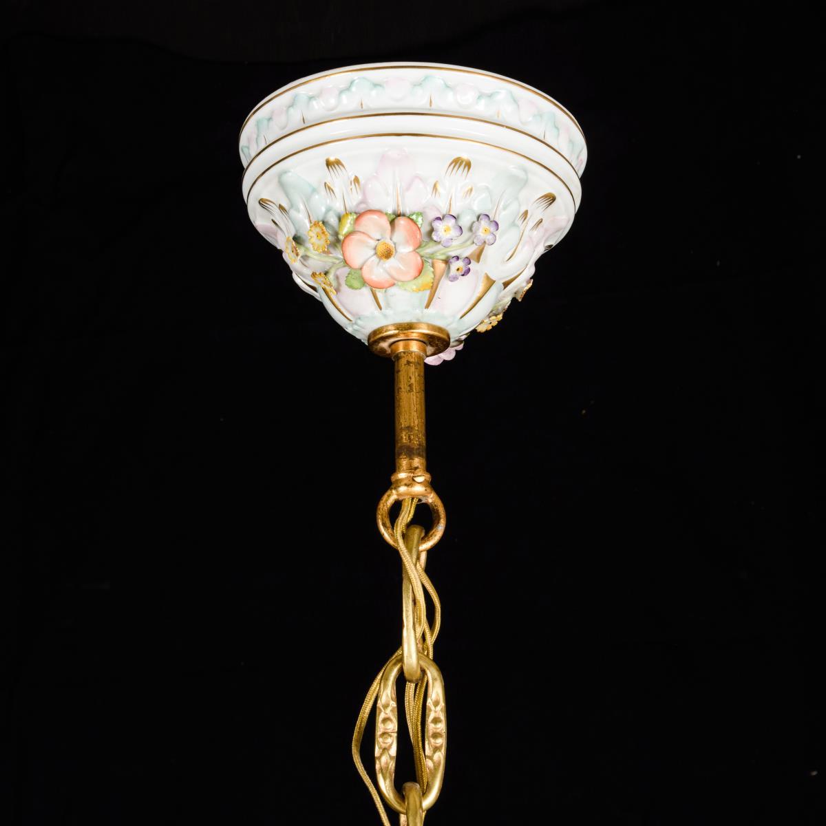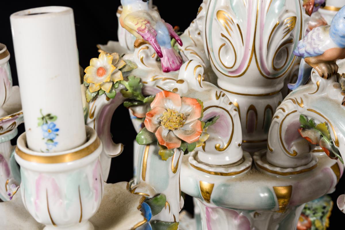 24-flammiger Leuchter mit 2x 6 s-förmigen Leuchterarmen an mehrgliedrigem Rocaillereliefschaft, mit elektrischen Tüllen. Mit reichem Blütenbelag, auf den Leuchterarmen sitzenden Putten und Papageienvögeln sowie 13 Blumenbuketts als Behang. 2 Blüten minimal bestoßen.