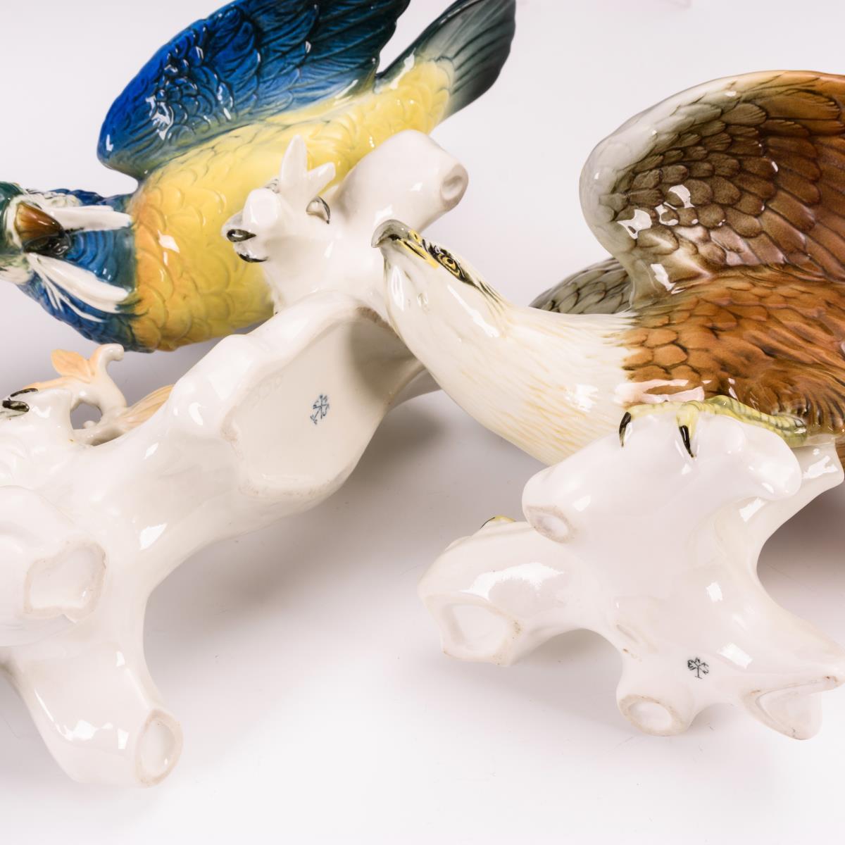 Unterglasurbemalung. Kakadugruppe H 26,5 cm, Bussard H 23,5 cm.