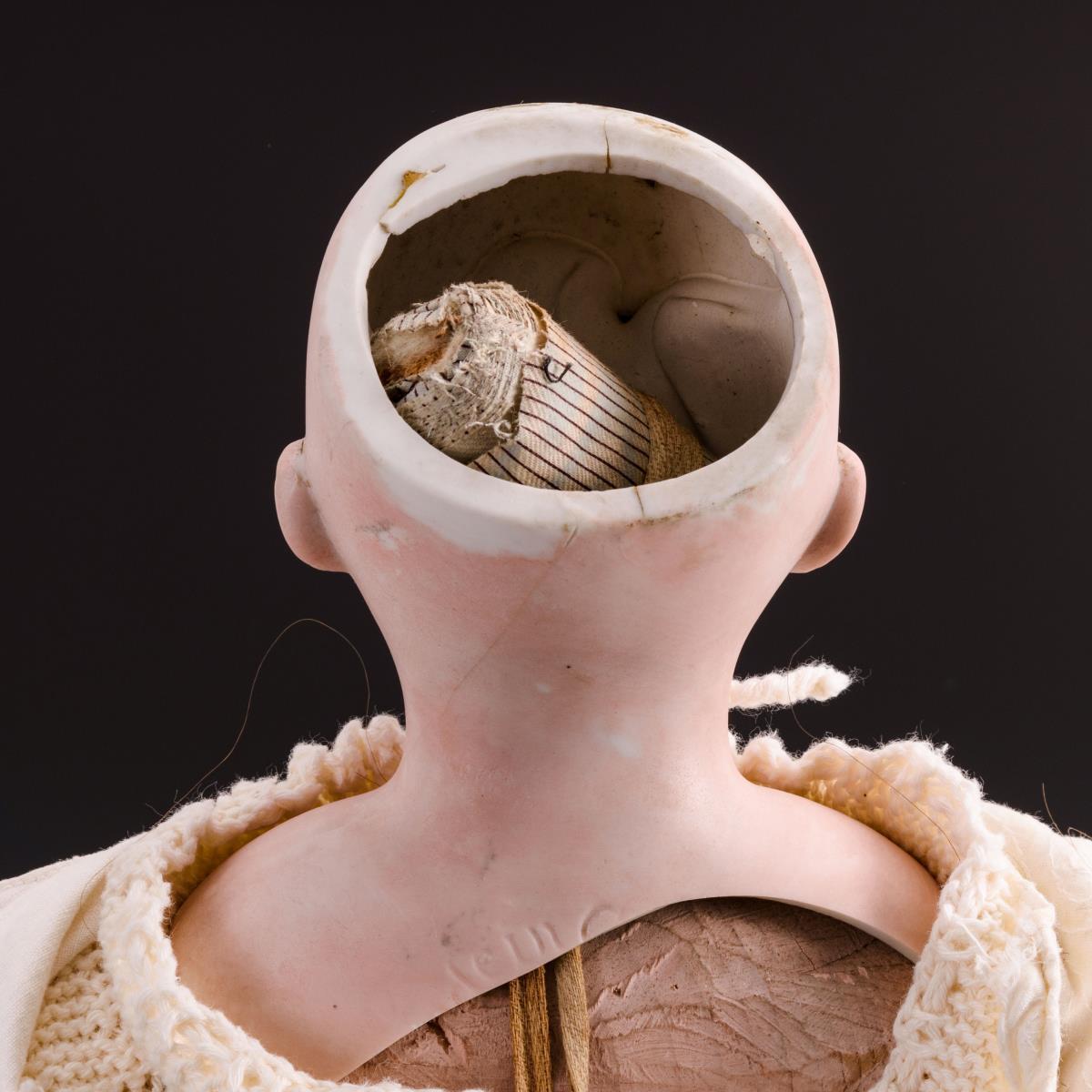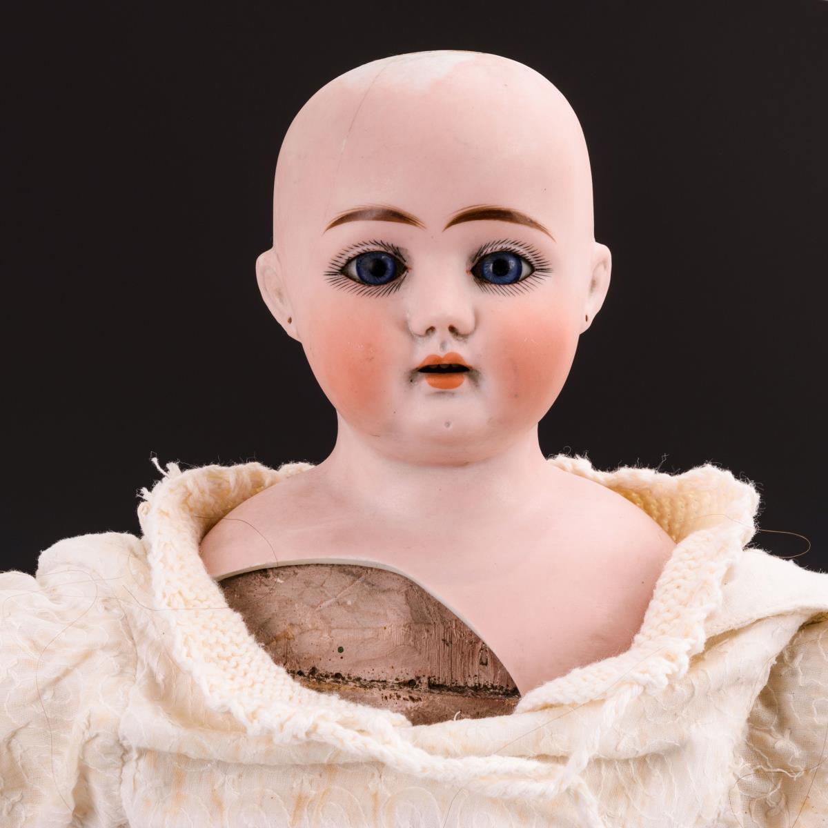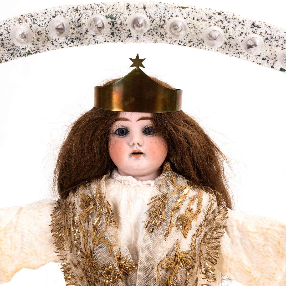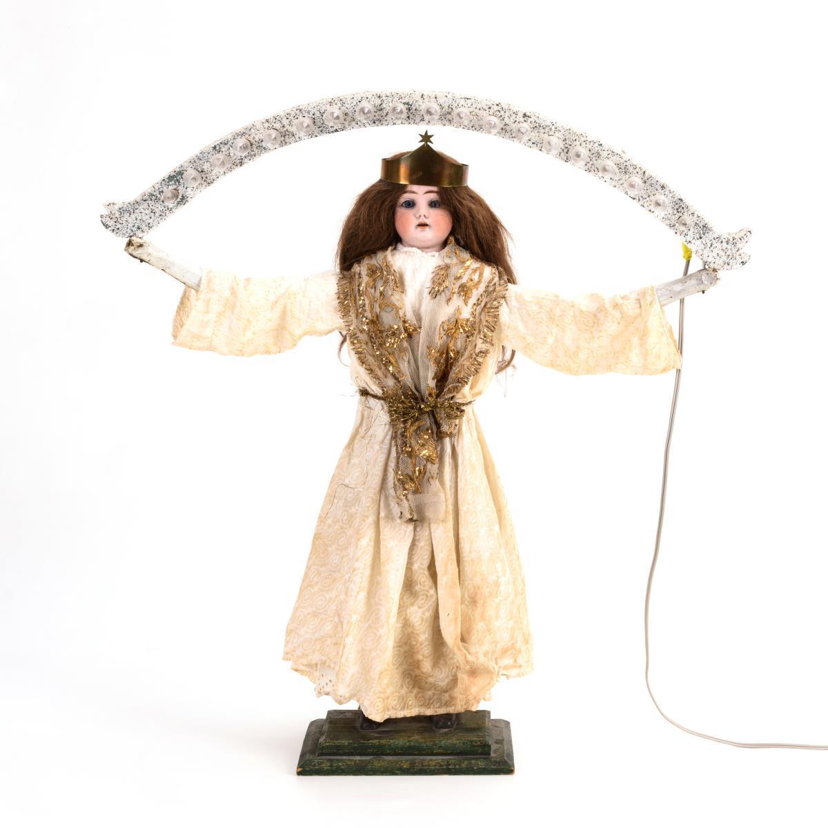 Defekter Puppenkopf, feste blaue Augen, braune Echthaarperücke und geschnitzter Holzkörper in weißem Gewand. Brustkopf mit Brand- und Haarrissen, Brustblatt mit Ausbrüchen. Lichtbogen alt verkabelt, Funktion nicht geprüft.