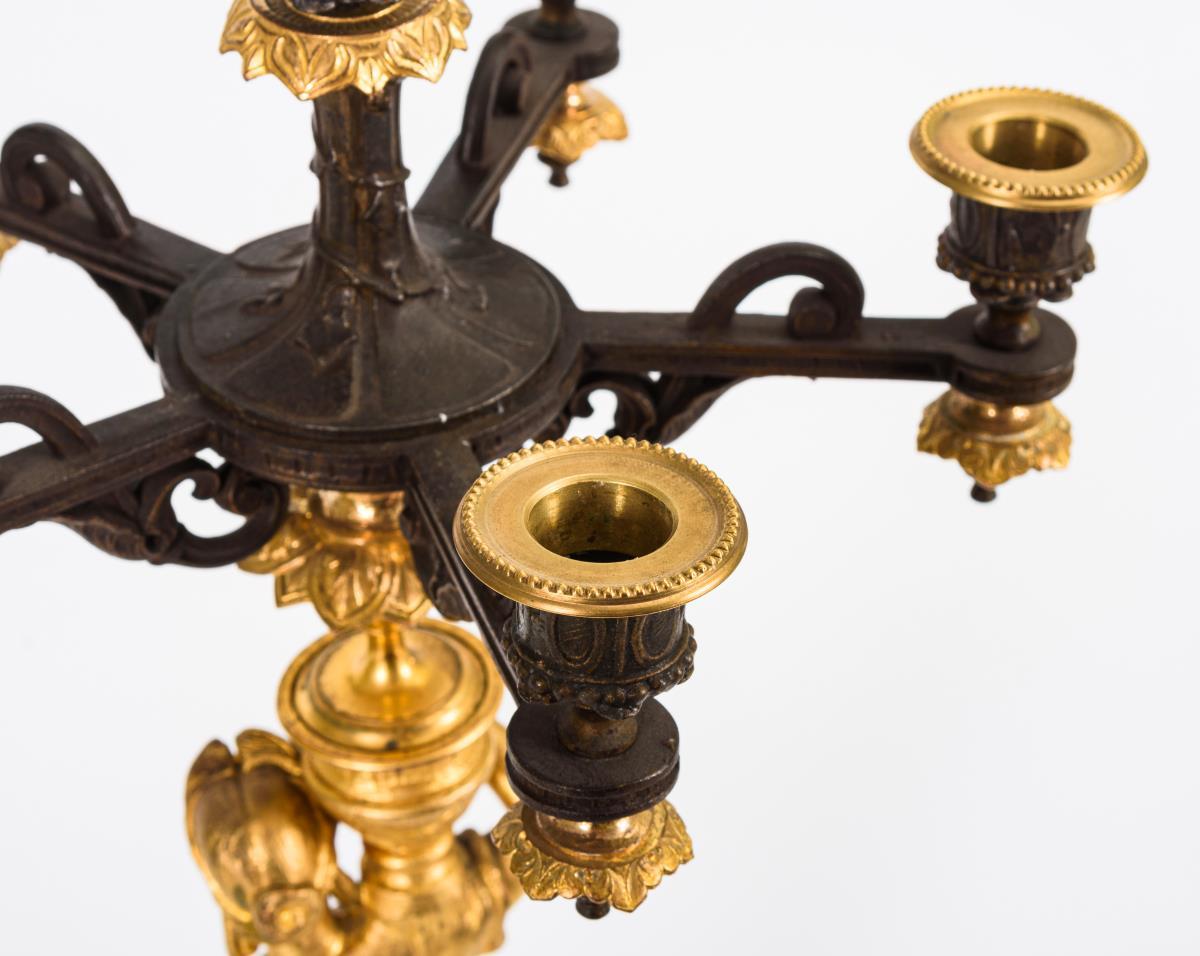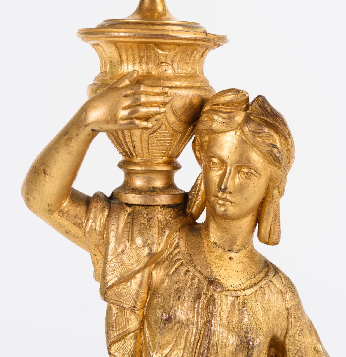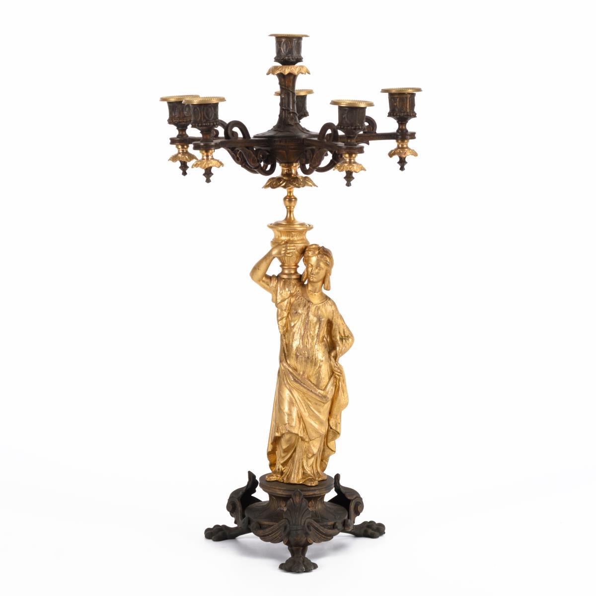 Rundfuß mit Tatzenfüßen, Standfigur einer Vasenträgerin als Schaft, Armaufsatz mit erhöhter Zentraltülle. Minimaler Haarriss am Hals und einer Abhängung, Bronzierung berieben, 1 Wachsteller ergänzt.