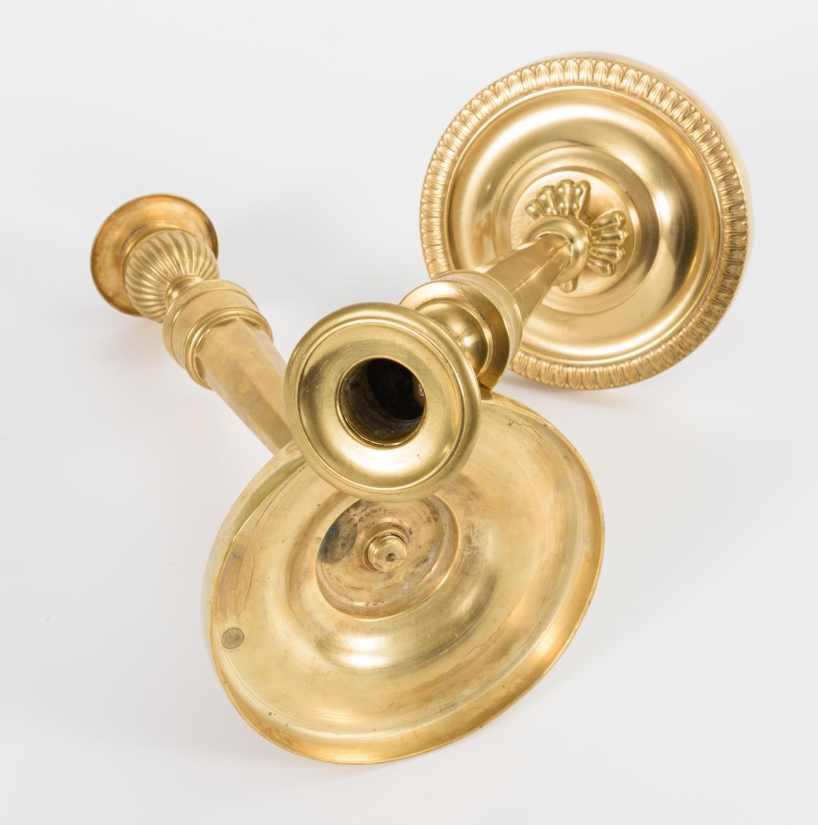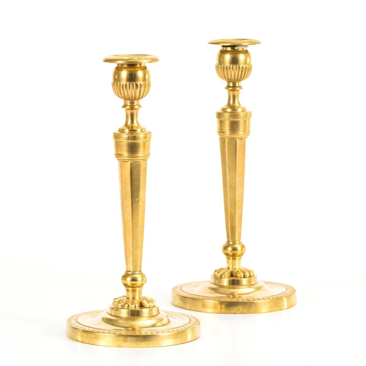 Bronzeleuchter mit Blattfries am Rundfuß, 3 Tatzen als Schaftansatz, konisch ansteigender Oktogonalschaft und Vasentülle. Ein Wachsteller gerissen.